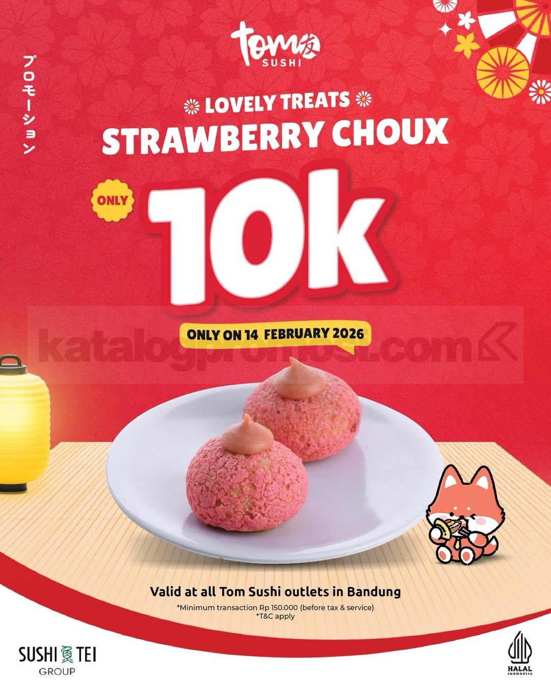 Promo Tom Sushi Lovely Treats Strawberry Choux Rp. 10.000 dengan minimal transaksi Rp.150.000 berlaku 14 Februari 2026 di seluruh outlet