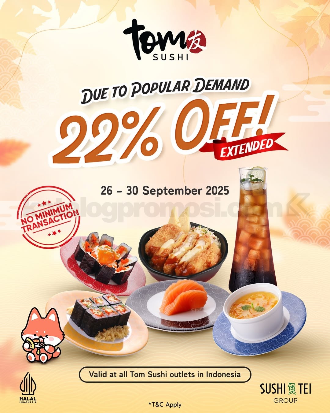Promo Sushi Tei Goup 22nd Anniversary di semua outlet Tom Sushi! Nikmati diskon 22% hingga 30 September 2025 tanpa minimal transaksi.