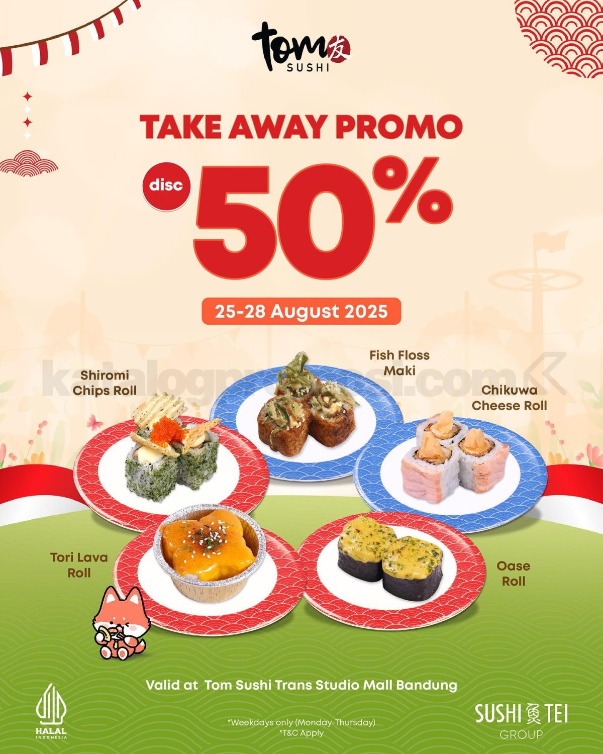 Promo Tom Sushi Take Away Diskon 50% untuk selected menu sushi pilihan, berlaku mulai tanggal 25–28 Agustus 2025 di outlet TSM Bandung