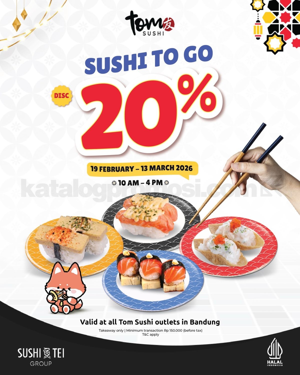 Promo Tom Sushi To Go Diskon 20% dengan minimum transaksi Rp. 150.000 sebelum pajak, berlaku mulai tanggal 19 Februari 2026 – 13 Maret 2026 di seluruh outlet Bandung.