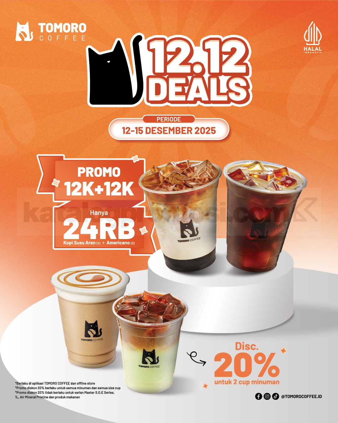 Promo Tomoro Coffee 12.12 Deals Diskon 20% untuk 2 Minuman dan penawaran 12K+12K, berlaku 12–15 Desember 2025 di seluruh outlet Tomoro Coffee.