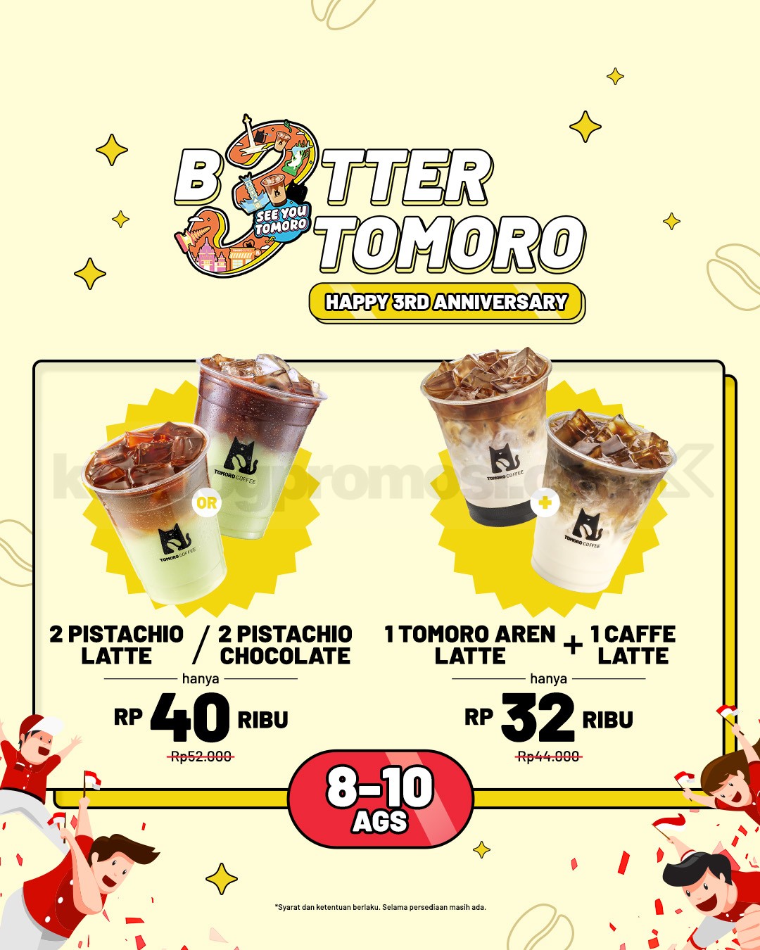 Di tanggal 8–10 Agustus, nikmati paket hemat 2 Pistachio Latte atau 2 Pistachio Chocolate Rp40.000 (dari Rp52.000) serta 1 Tomoro Aren Latte + 1 Caffe Latte Rp32.000 (dari Rp44.000). Semua promo berlaku dengan ketentuan yang sudah ditentukan oleh Tomoro Coffee.
