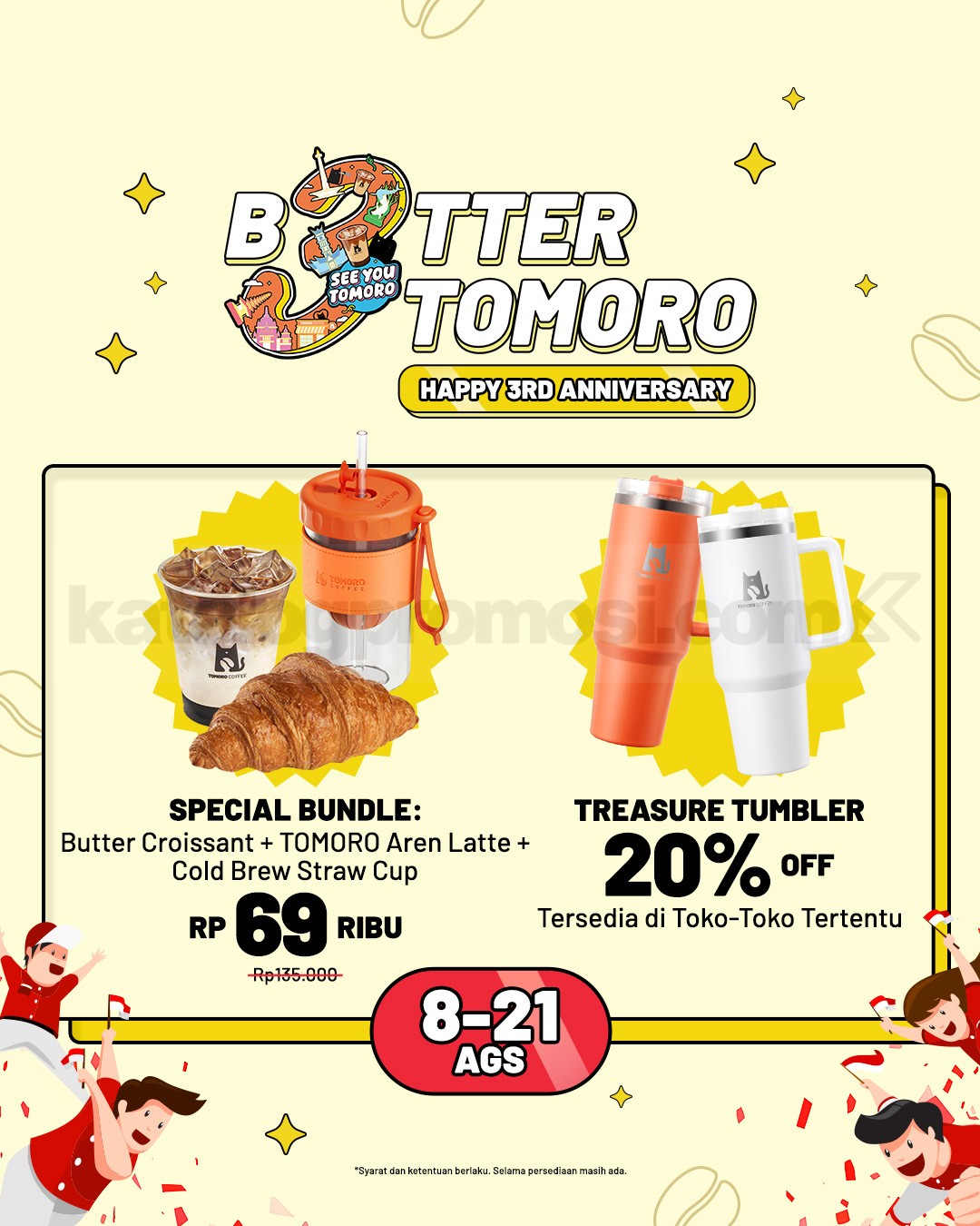 Selain itu, tersedia rangkaian penawaran lain selama periode 8–21 Agustus 2025, seperti Special Bundle berisi Butter Croissant, Tomoro Aren Latte, dan Cold Brew Straw Cup hanya Rp69.000 dari Rp135.000. Ada juga Treasure Tumbler diskon 20% di toko tertentu.