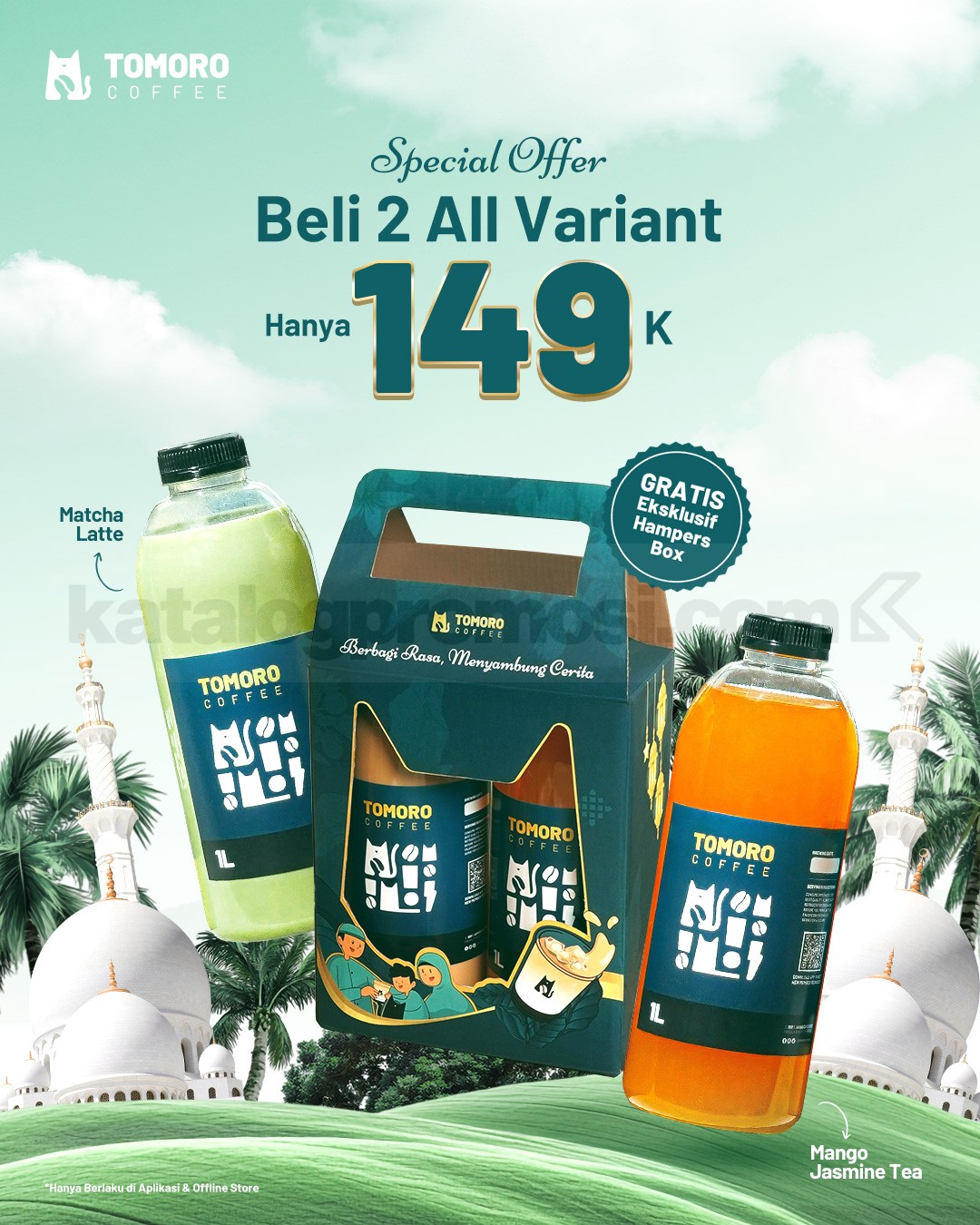 Promo Tomoro Coffee Ramadan Paket 2 Varian 1L Rp. 149 ribu gratis hampers box pembelian via aplikasi dan outlet berlaku selama Ramadan.