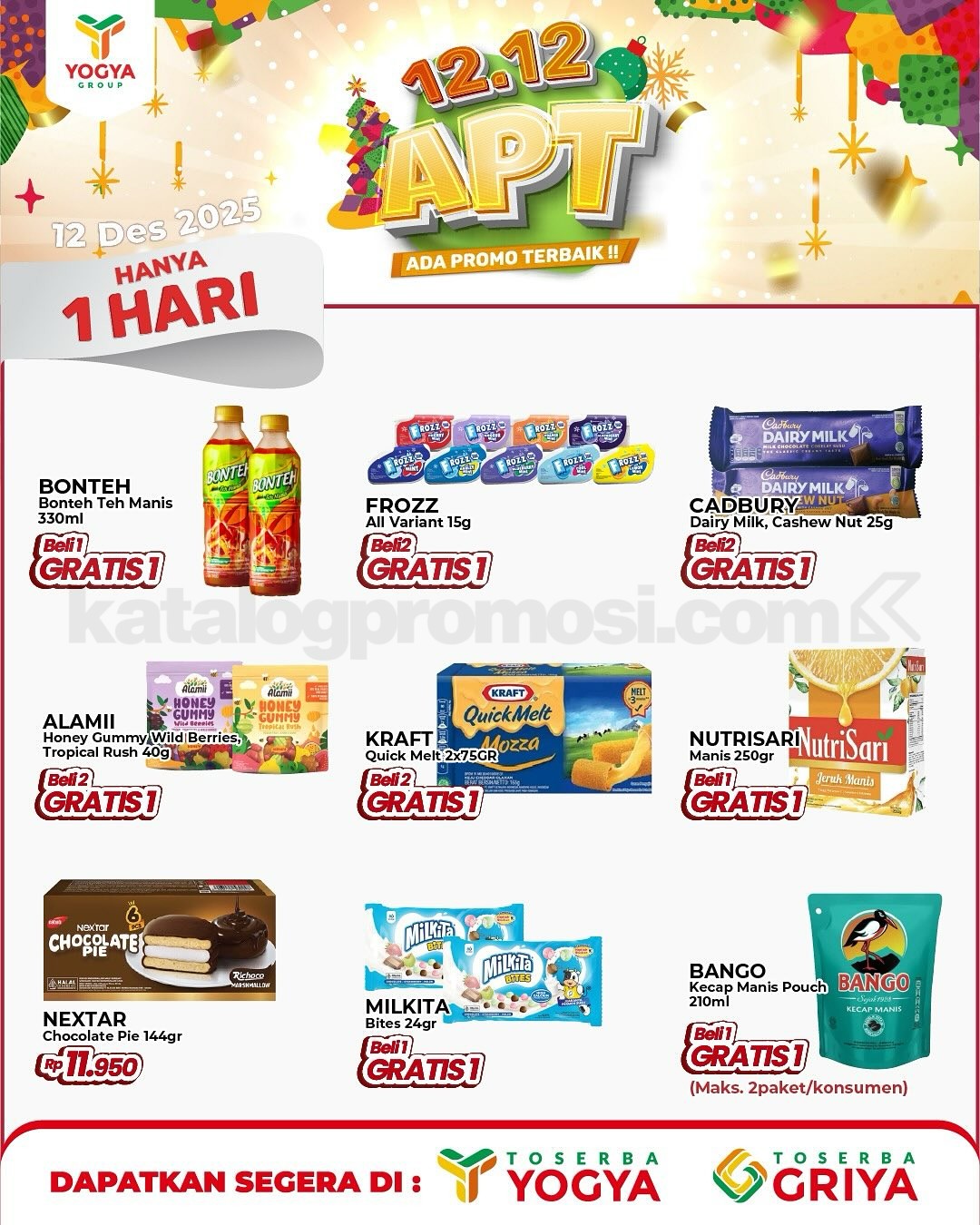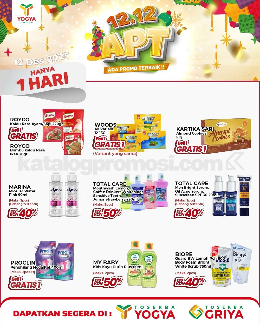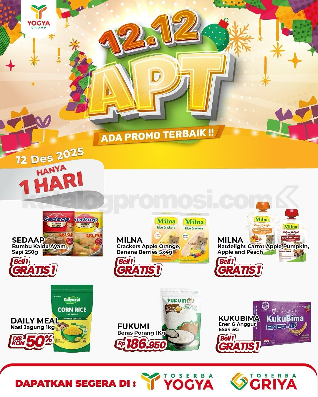 Promo Toserba Yogya 12.12 Double Date Beli 1 Gratis 1 berlaku 12 Desember 2025 dengan promo supermarket, elektronik, dan kuliner: beli 1 gratis 1, diskon 50%, dan promo spesial.