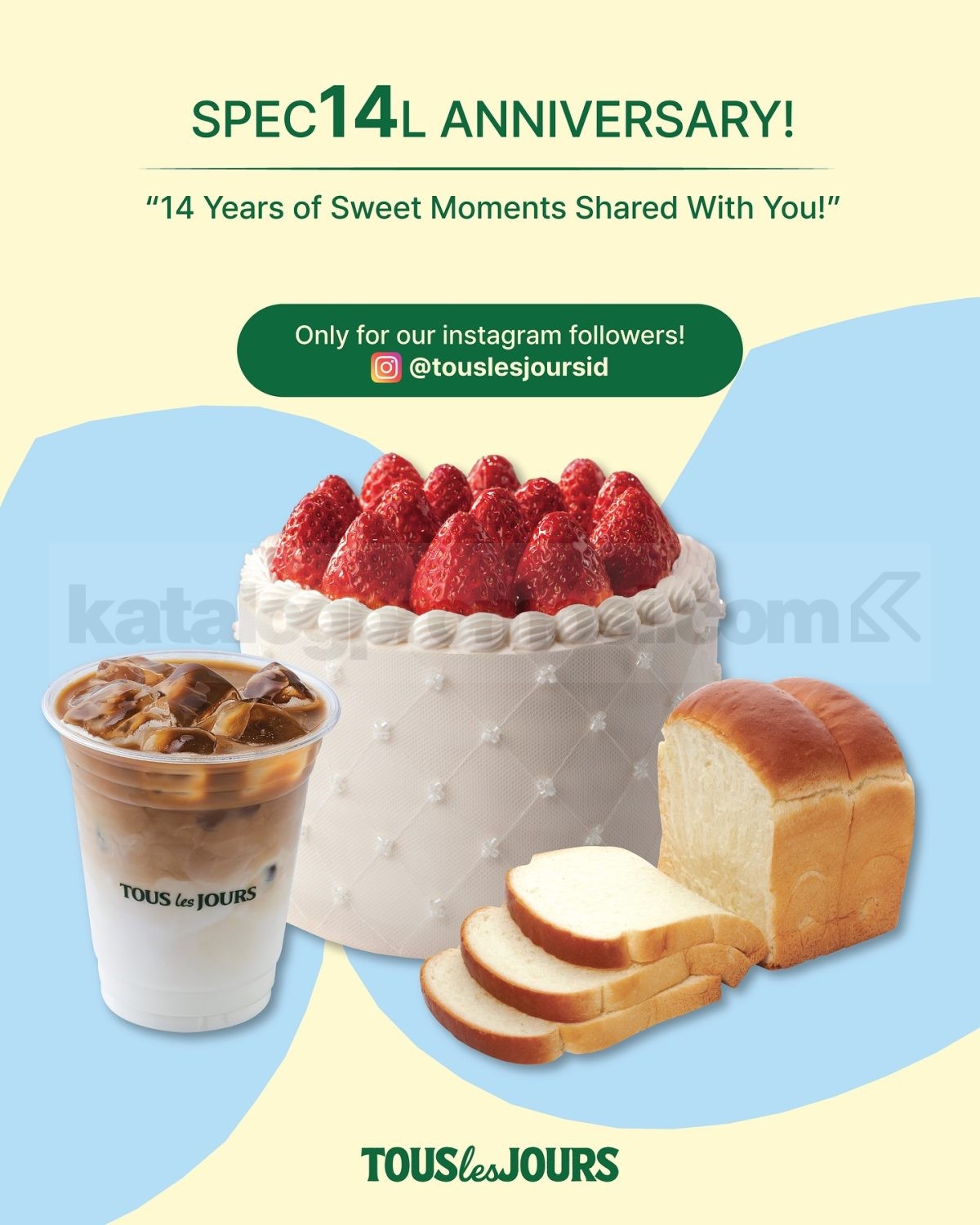 Promo Tous Les Jours 14th Anniversary diskon 30% untuk whole cakes, breads, dan beverages berlaku 1 hari di seluruh outlet dengan pembelian in-store.