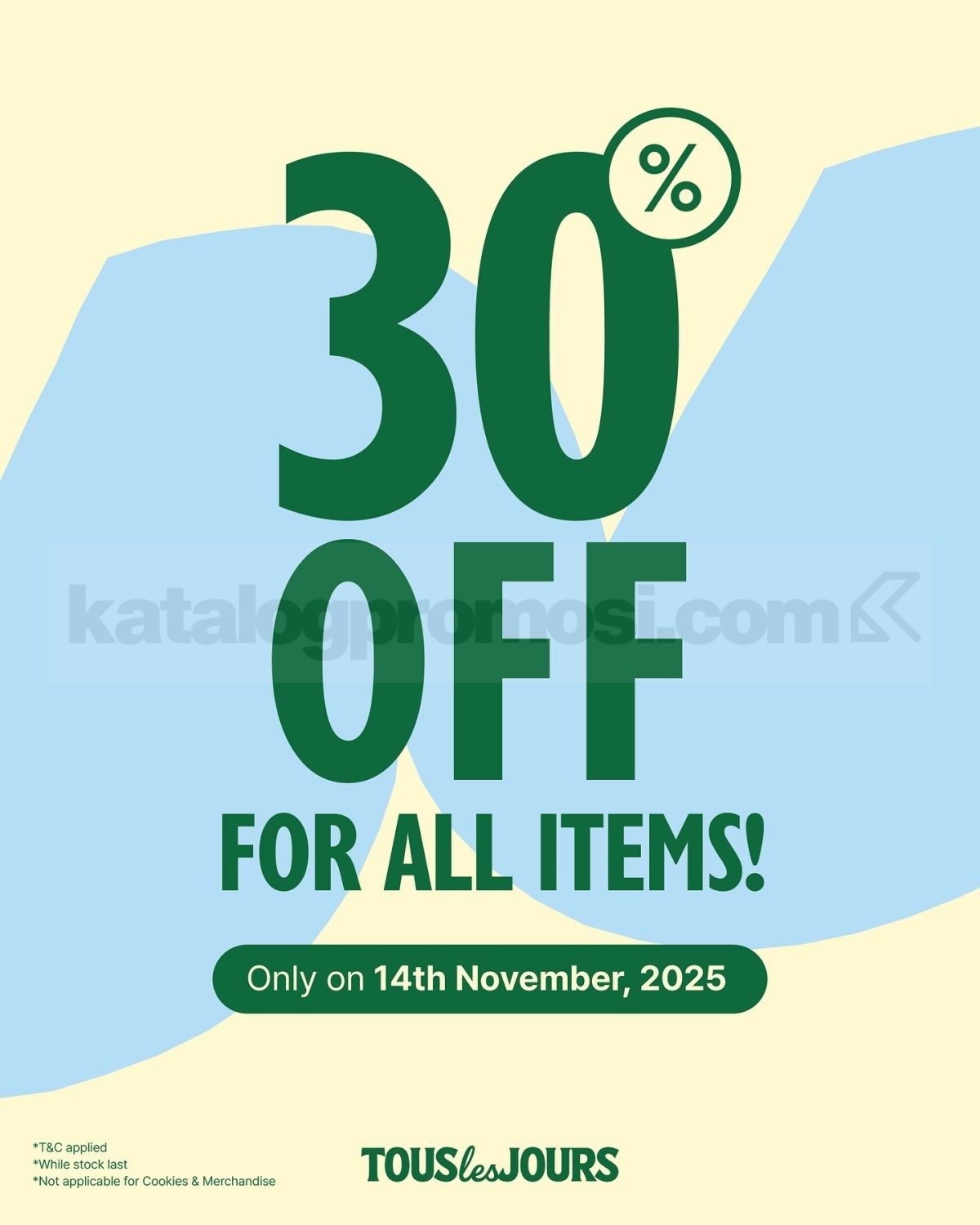 Promo Tous Les Jours 14th Anniversary diskon 30% all items ini bisa kamu manfaatkan sebagai momen untuk mencoba menu baru atau membeli favorit lama dengan harga lebih hemat selama satu hari perayaan.