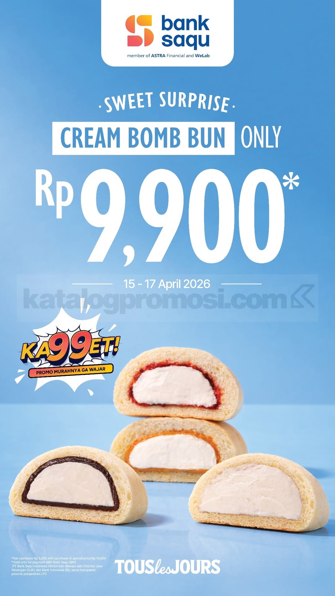 Promo Tous Les Jours Bank Saqu Cream Bom Bun Rp. 9.900 dengan cashback QRIS Bank Saqu berlaku 15 April 2026 – 17 April 2026 di seluruh outlet