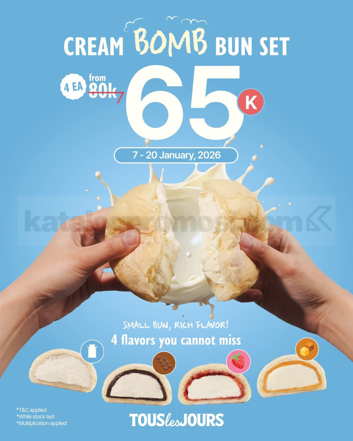 Promo Tous Les Jours Cream Bomb Bun Set harga Rp. 65.000 untuk satu set 4 varian rasa dengan isian krim melimpah, berlaku mulai tanggal 7 Januari 2026 – 20 Januari 2026 di outlet tertentu.