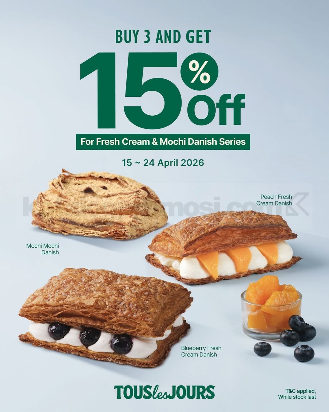 Program diskon 15% untuk pembelian minimal 3 produk varian Fresh Cream Danish Peach, Blueberry, serta Mochi Mochi Danish selama periode 15 – 24 April di store Tous les Jours.