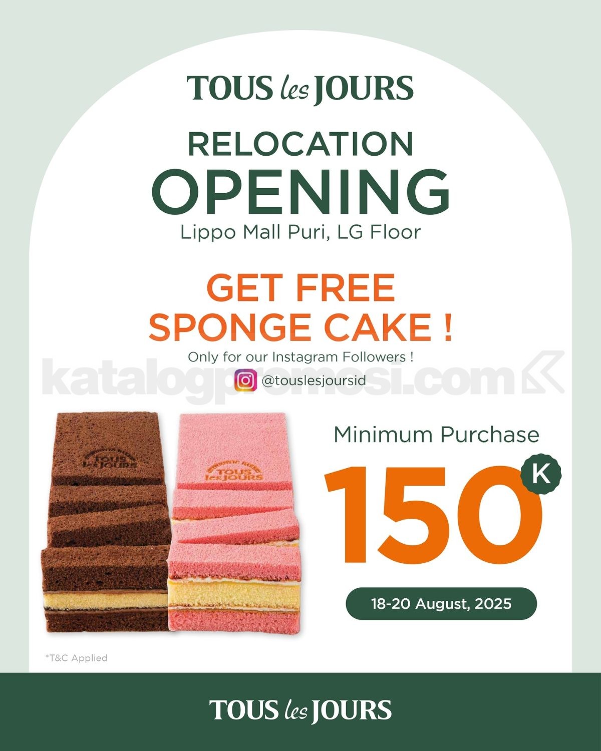Promo Tous Les Jours Lippo Mall Puri re-opening! Gratis 1 Sponge Cake, Buy 3 Get 1 & Diskon 50% Sampai 24 Agustus 2025.