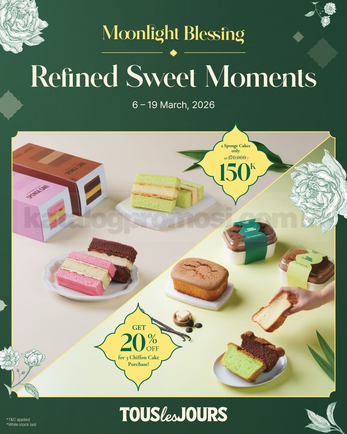 Promo Tous les Jours Moonlight Blessing 2 Sponge Cake Rp. 150.000 dan diskon 20% Chiffon Cake untuk pembelian 3 cake berlaku mulai tanggal 6 Maret 2026 – 19 Maret 2026 di seluruh outlet.