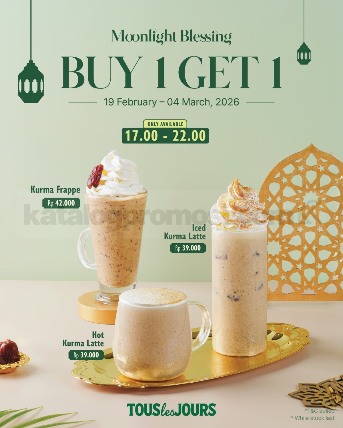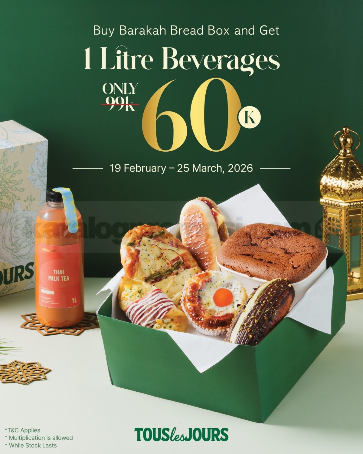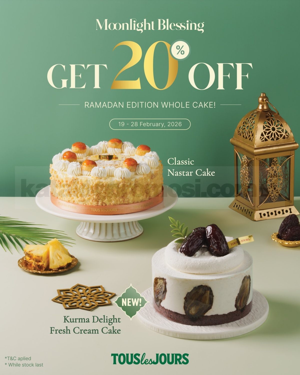 Promo TOUS les JOURS Moonlight Blessing Diskon 20% Whole Cake untuk Classic Nastar dan Kurma Delight berlaku mulai tanggal 19 Februari 2026 – 25 Maret 2026 di seluruh outlet.