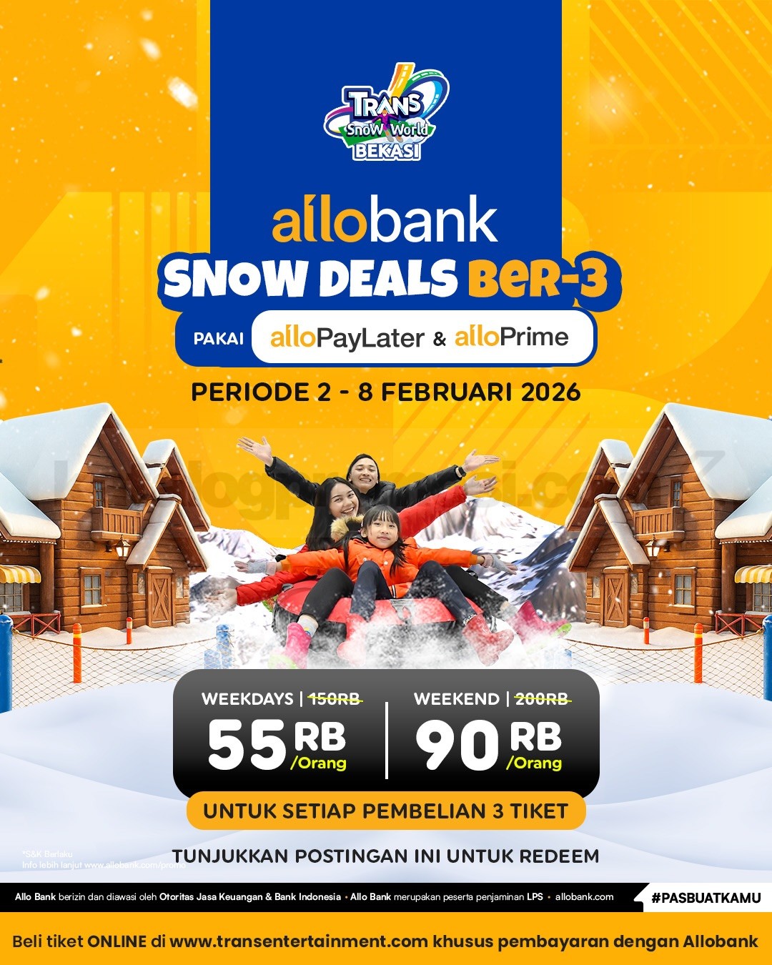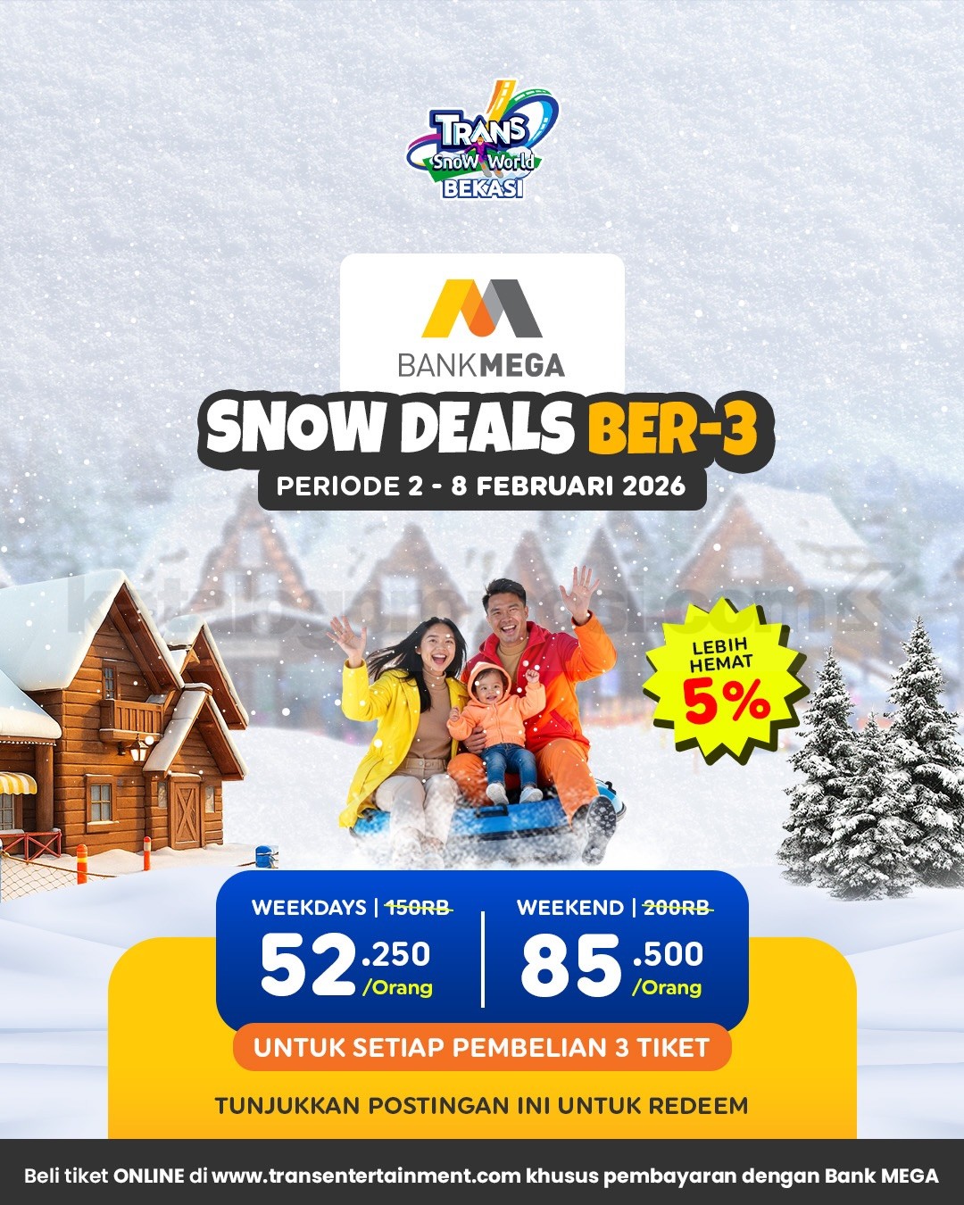 Promo Trans Snow World Bekasi Bank Partner Tiket Mulai Rp. 52.250 per orang dengan pembayaran Bank Mega, Livin Mandiri, dan AlloBank berlaku mulai tanggal 2-8 Februari 2026 di Trans Snow World Bekasi.