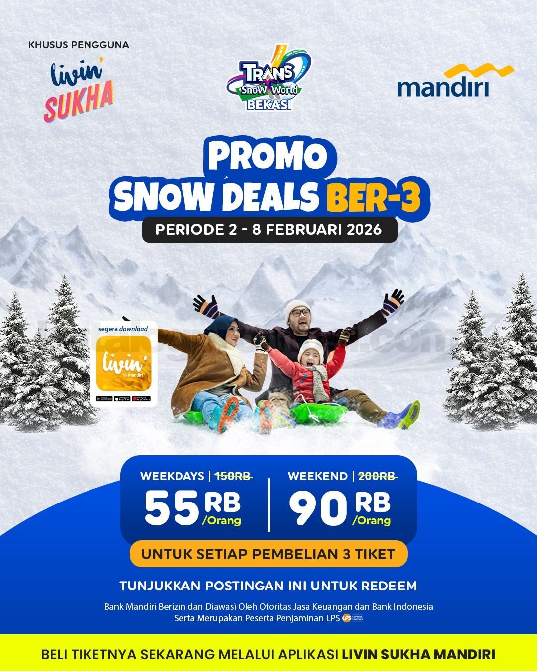 Promo tersedia di website Trans Entertainment, loket tiket Trans Snow World Bekasi, dan aplikasi Livin Sukha Mandiri sesuai metode pembayaran.