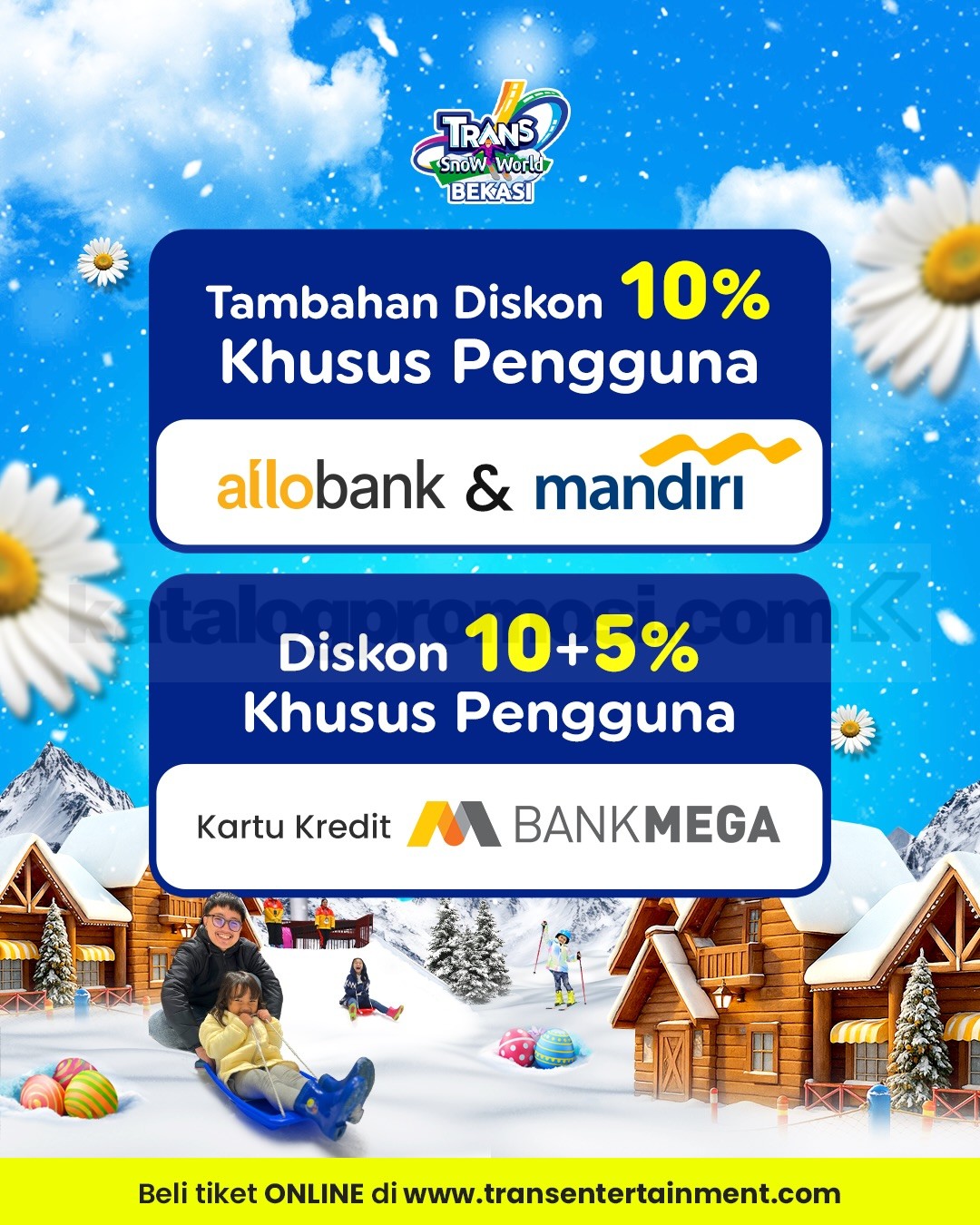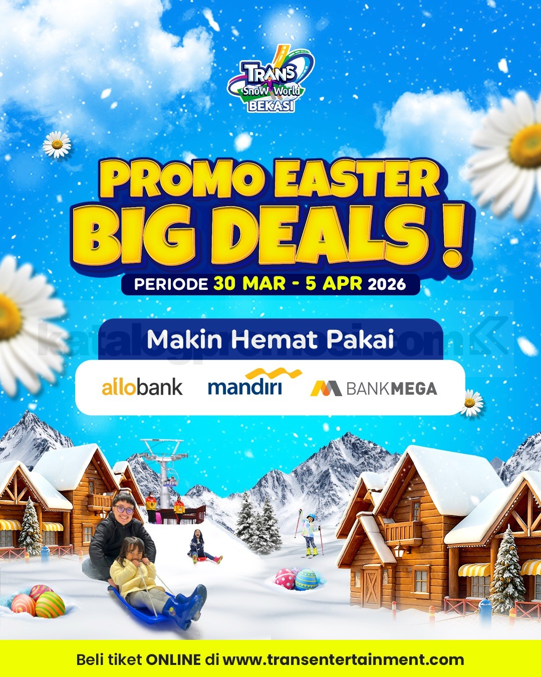 Promo Trans Snow World Bekasi Easter Big Deals diskon hingga 15% dengan Allobank, Mandiri, Bank Mega berlaku mulai tanggal 30 Maret 2026 – 5 April 2026.