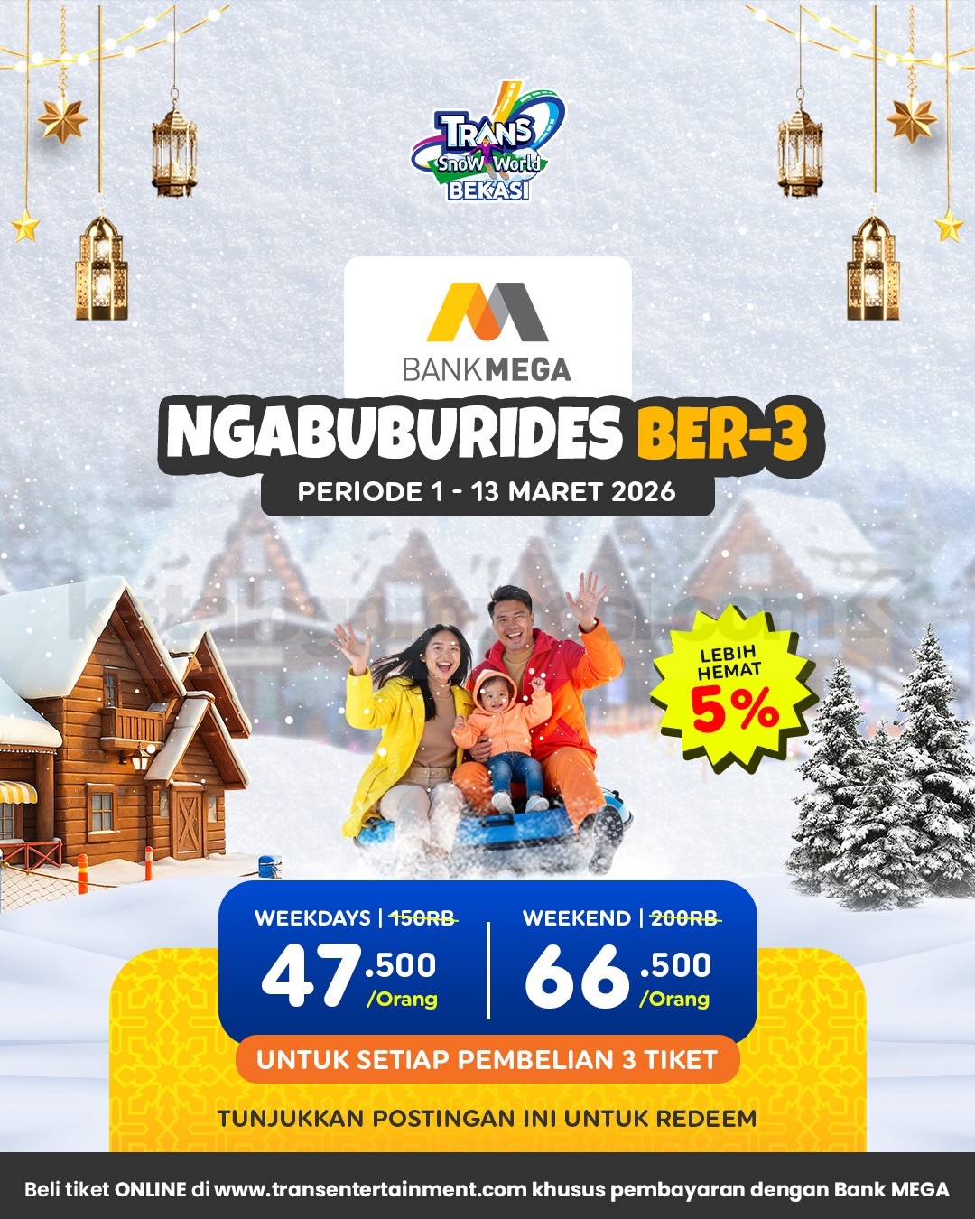 Promo Trans Snow World Bekasi Ngabuburides Ber-3 mulai Rp. 47.500 per orang untuk pembelian 3 tiket, berlaku mulai tanggal 1 Maret 2026 – 13 Maret 2026 di Bekasi.