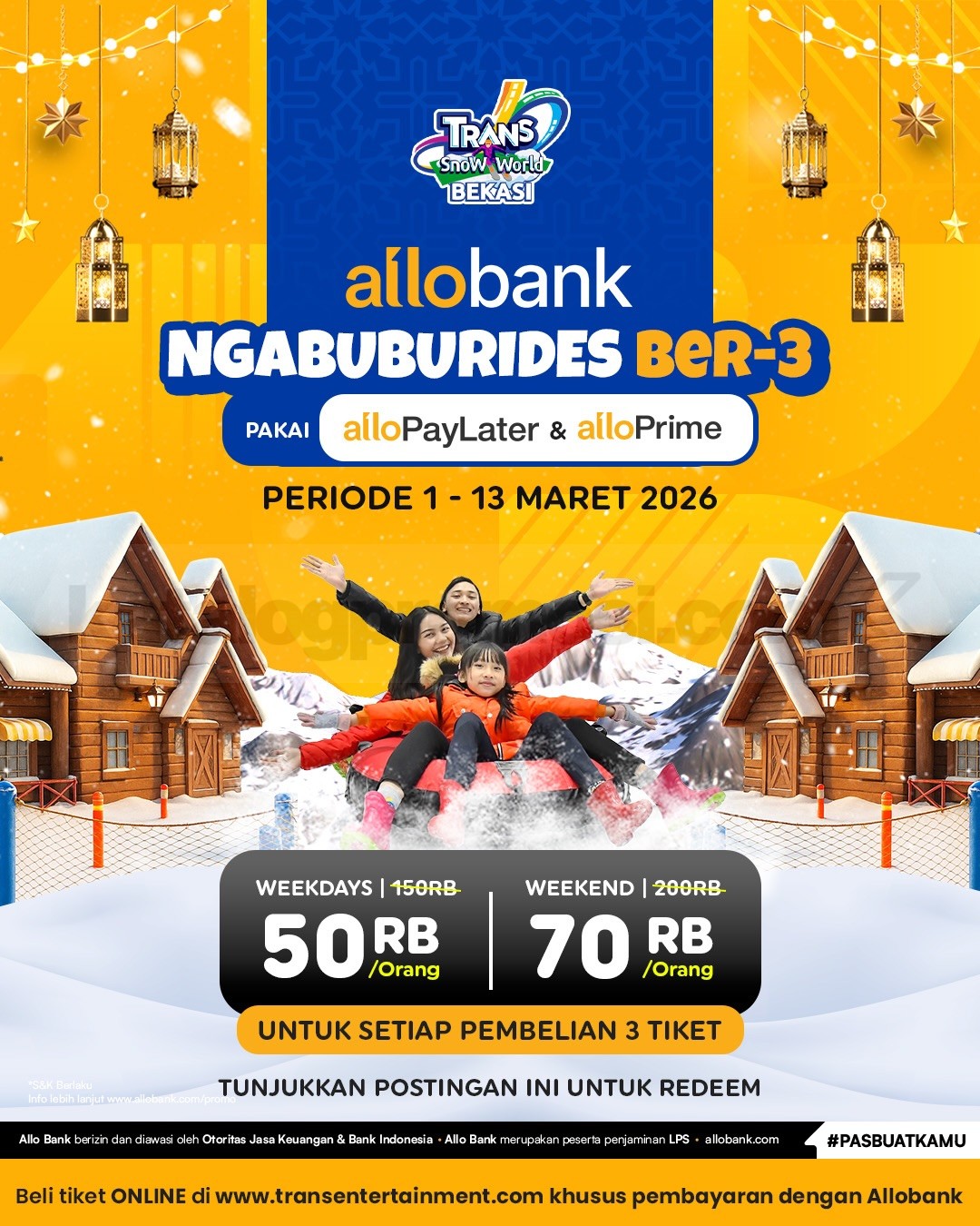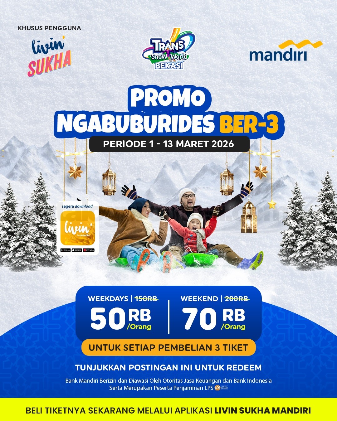 Berlaku selama periode promo berlangsung, jadi pastikan kamu atur jadwal main salju bareng teman sebelum kuotanya penuh. Ngabuburit jadi beda, karena bisa seru-seruan di tengah salju tanpa harus ke luar negeri! ☃️