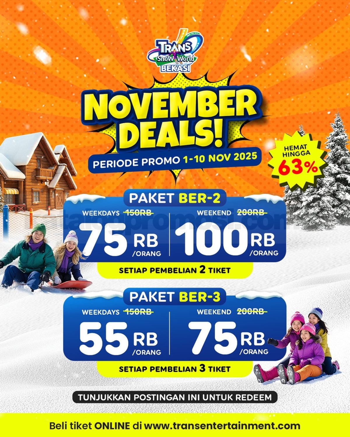 Promo Trans Snow World Bekasi November Deals! mulai Rp55.000/orang, seru-seruan di salju, beli tiket online hemat, berlaku 1–10 November 2025.