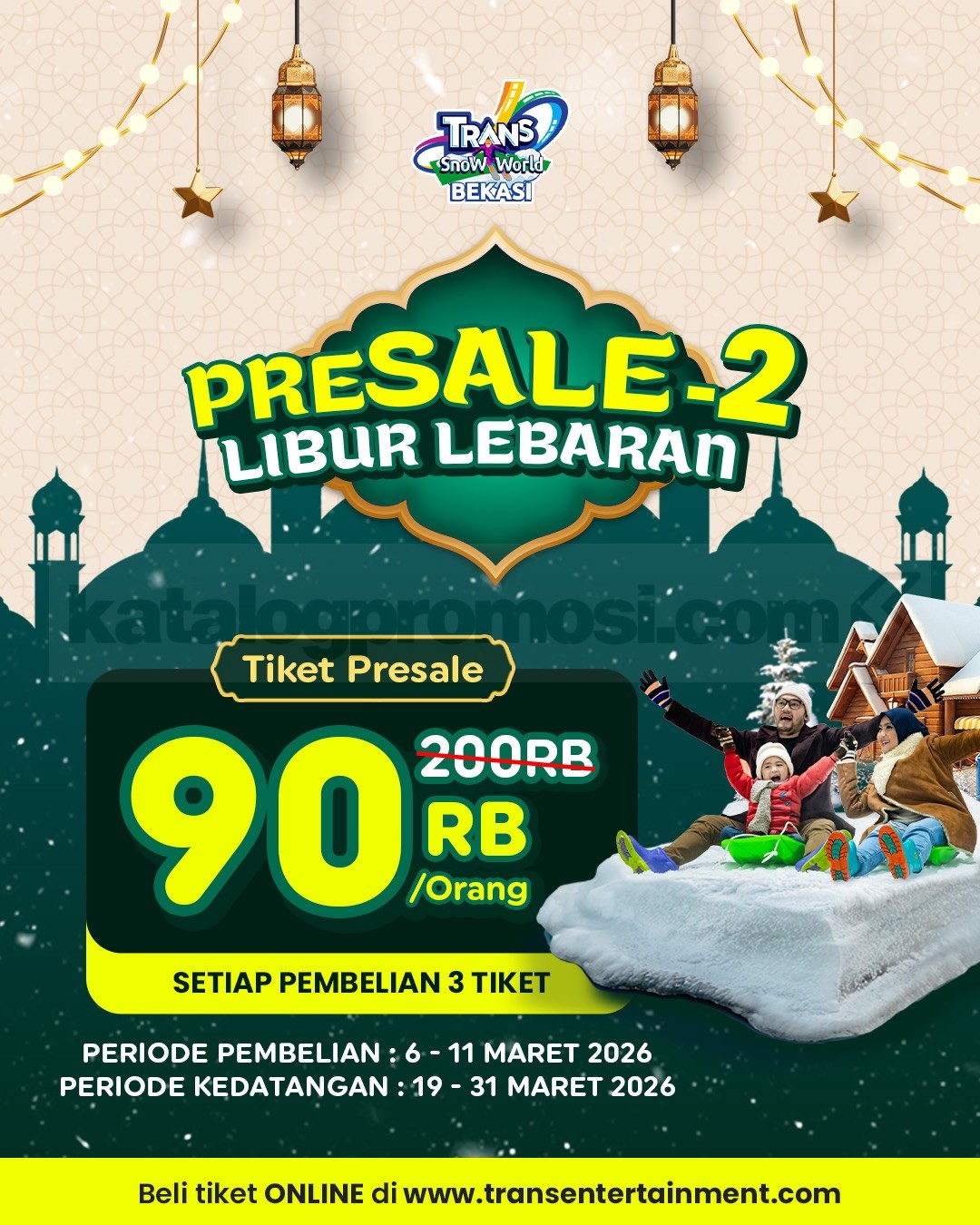 Promo Trans Snow World Bekasi Presale 2 Libur Lebaran Rp. 90.000 min. 3 tiket untuk bermain salju lebih hemat berlaku mulai tanggal 6 Maret 2026 – 11 Maret 2026.
