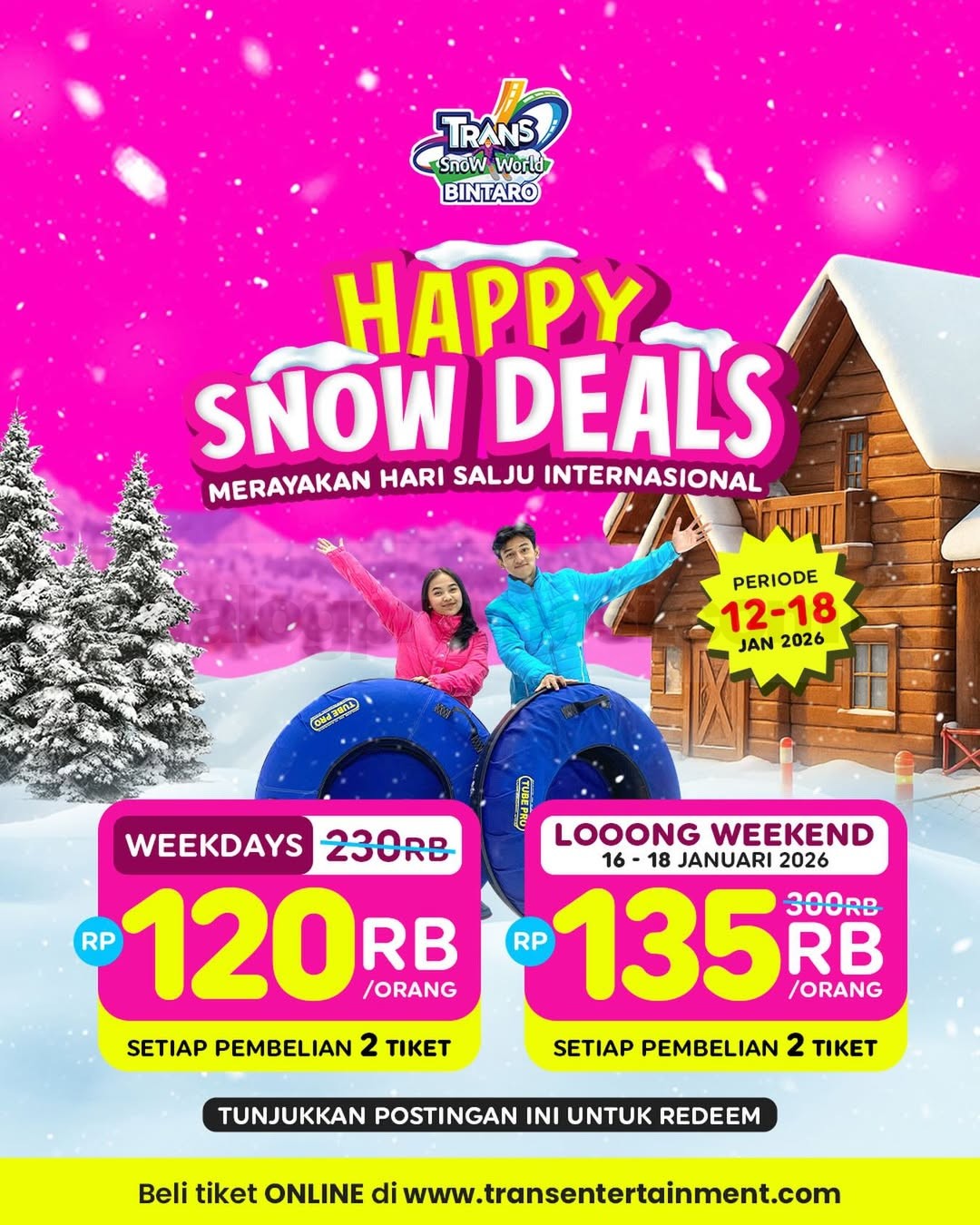 Promo Trans Snow World Bintaro Happy Snow Deals Mulai Rp.120.000 dengan pembelian 2 tiket, termasuk kereta gantung dan sepatu boots, berlaku mulai tanggal 12 – 18 Januari 2026.