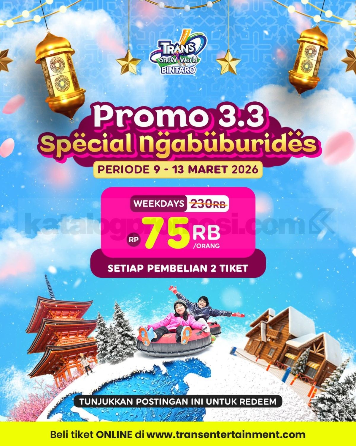 Promo Trans Snow World Bintaro Ngabuburides Main Salju Rp. 75.000 dengan pembelian 2 tiket termasuk kereta gantung dan sepatu boots berlaku mulai tanggal 9-13 Maret 2026.
