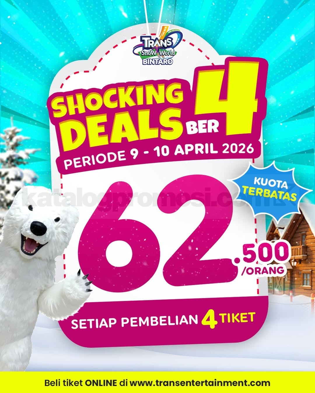 Sekarang kamu bisa merasakan serunya bermain salju di dalam ruangan dengan harga yang jauh lebih hemat. Lewat promo spesial ini, cukup bayar Rp. 62.500 per orang dengan pembelian 4 tiket sekaligus, kamu sudah bisa menikmati berbagai wahana seru yang ada di Trans Snow World Bintaro.