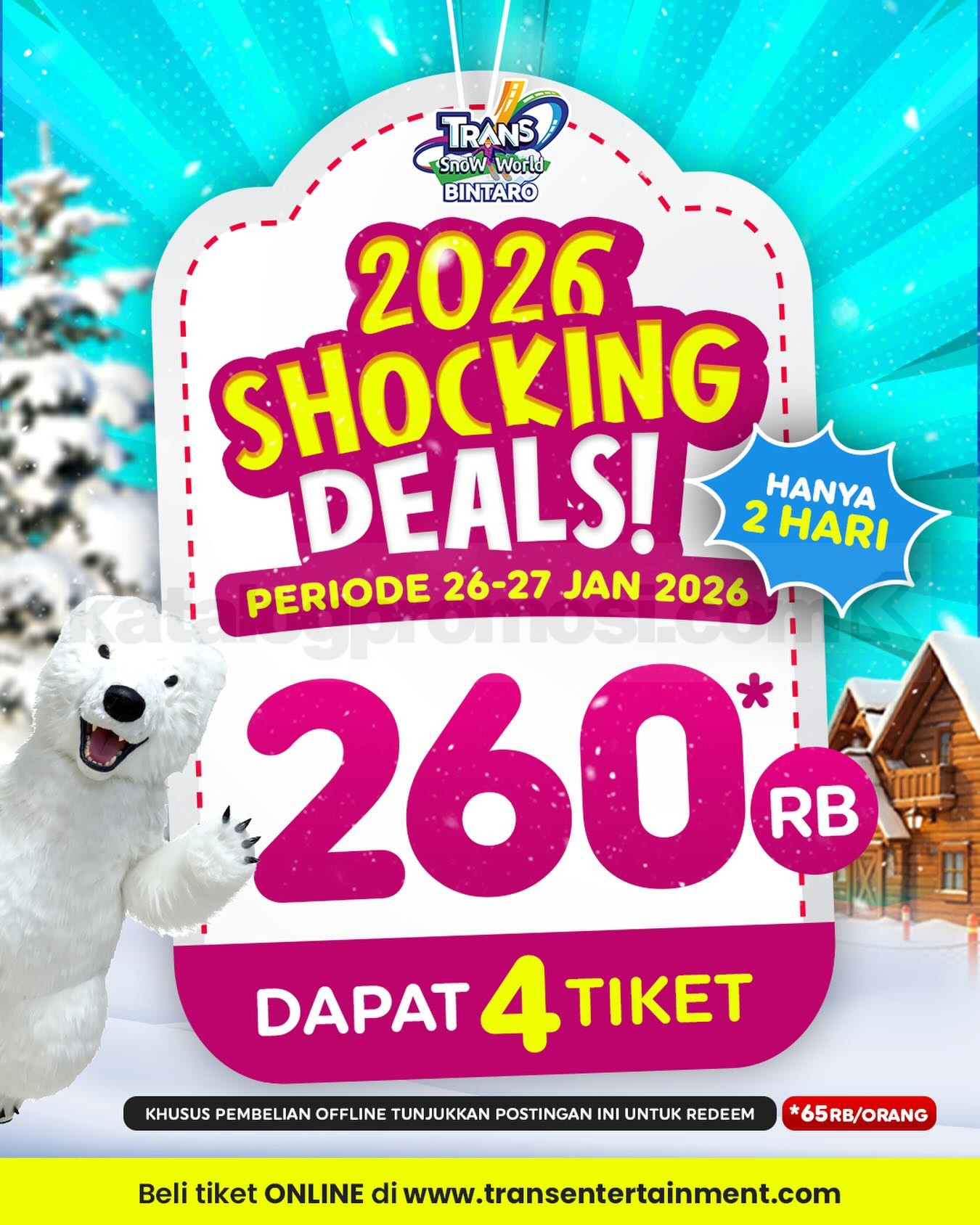 Promo Trans Snow World Bintaro Shocking Deals Tiket mulai Rp. 65.000 dengan pembelian 4 tiket, termasuk gondola dan sepatu, berlaku mulai tanggal 26 Januari 2026 – 27 Januari 2026.