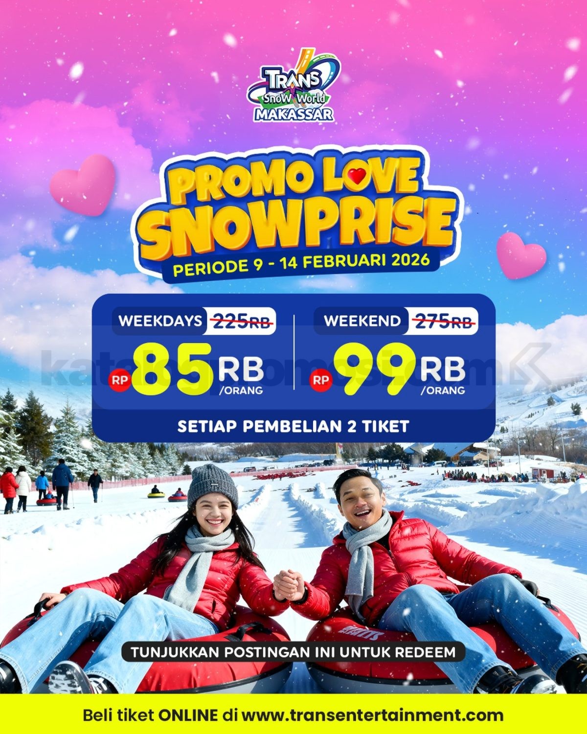 Promo Trans Snow World Makassar Love Snowprise tiket mulai Rp. 85.000 untuk pembelian 2 tiket, quality time seru bernuansa salju, berlaku mulai tanggal 9-14 Februari 2026 di Trans Snow World Makassar.