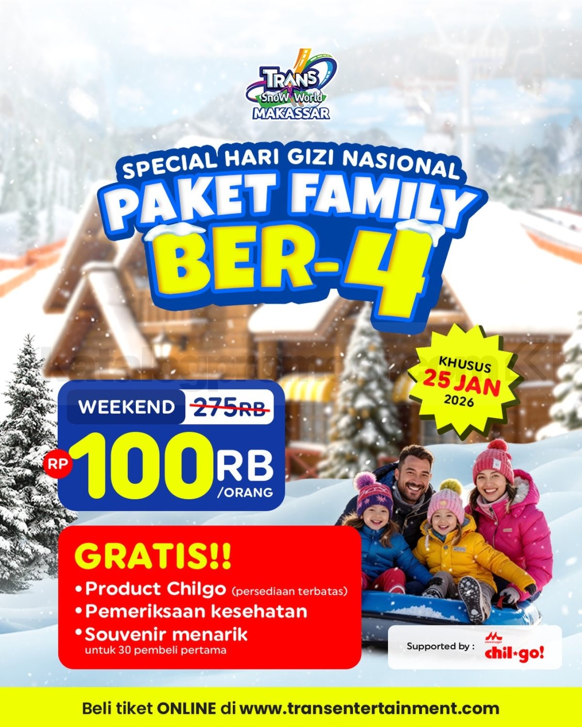 Keseruan Promo Trans Snow World Makassar Paket Family Rp. 100.000 semakin lengkap dengan bonus produk Chilgo yang dibagikan selama persediaan masih ada. Selain itu, 30 pengunjung pertama juga berkesempatan mendapatkan souvenir menarik sebagai kenang-kenangan dari momen spesial ini.