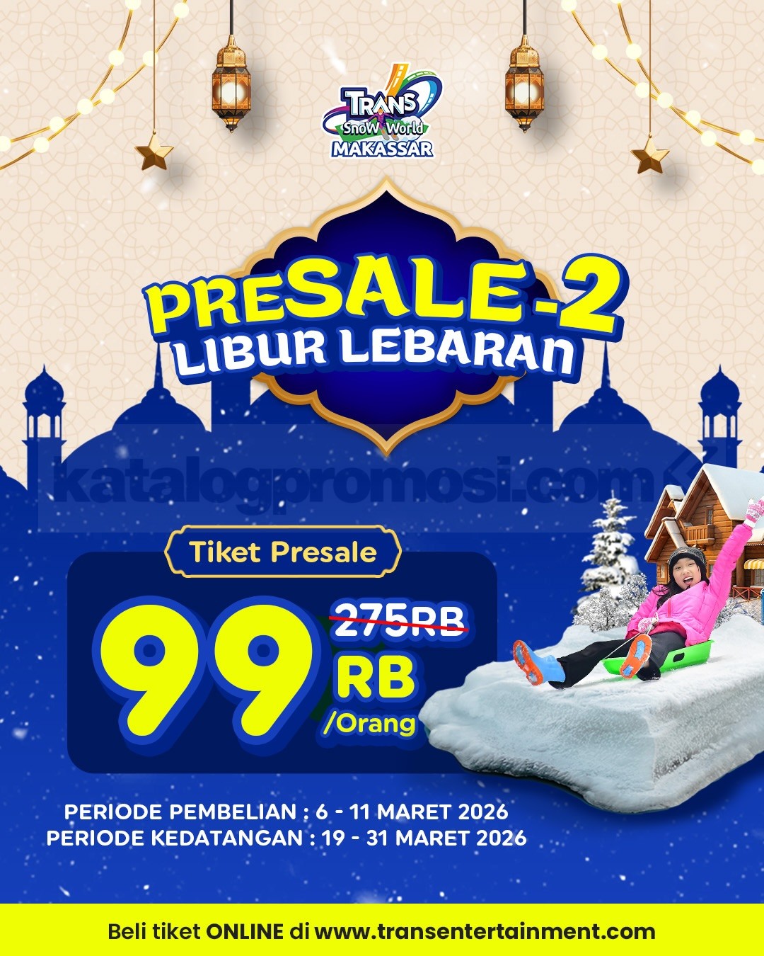 Promo Trans Snow World Makassar Presale 2 Tiket Lebaran Rp. 99.000 termasuk sepatu boots dan wahana bermain berlaku mulai tanggal 6 Maret 2026 – 11 Maret 2026.