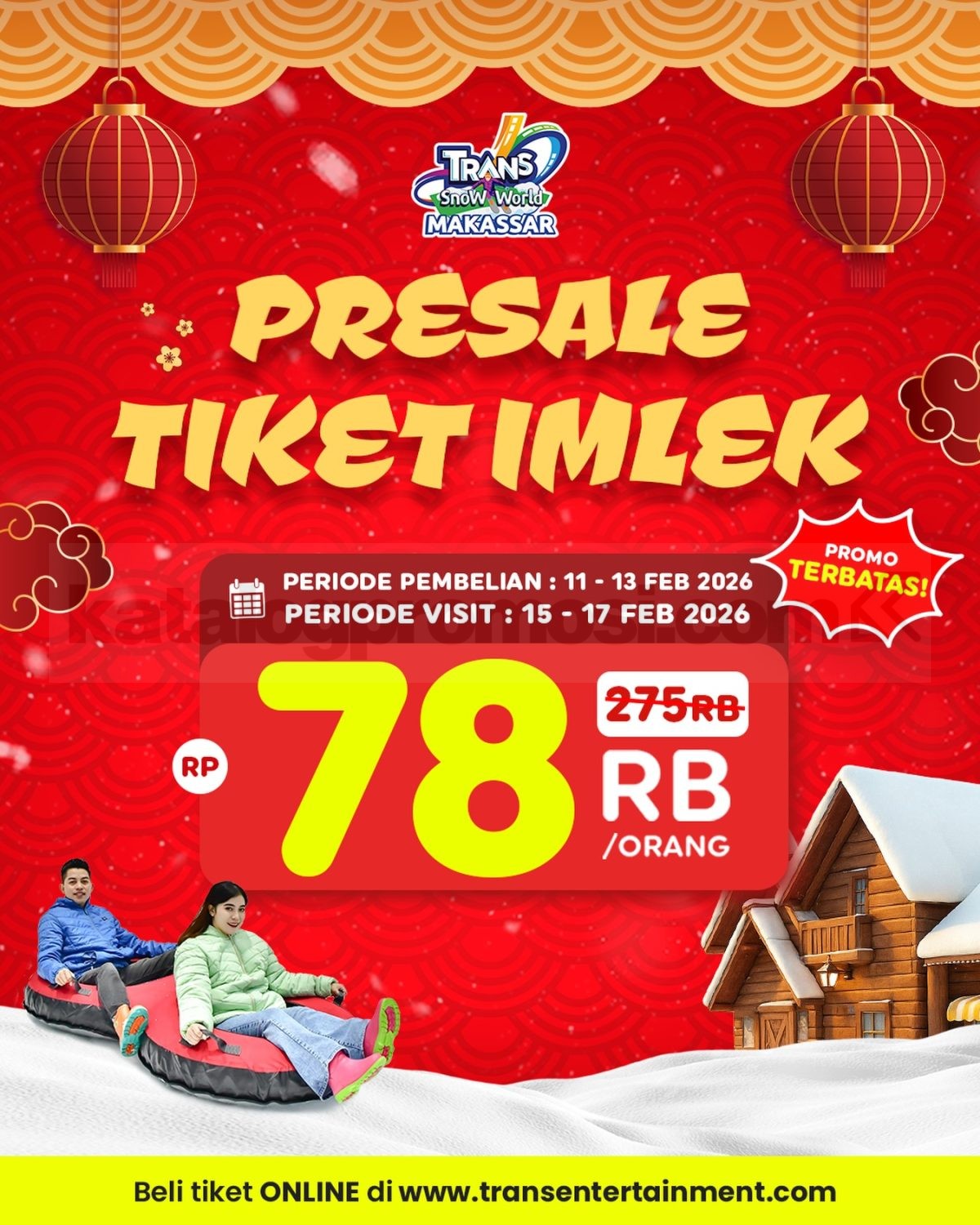 Promo Trans Snow World Makassar Presale Tiket Imlek Rp. 78.000 rasakan main salju saat Imlek dengan periode beli dan visit berbeda berlaku mulai tanggal 11-17 Februari 2026 di Trans Snow World Makassar.
