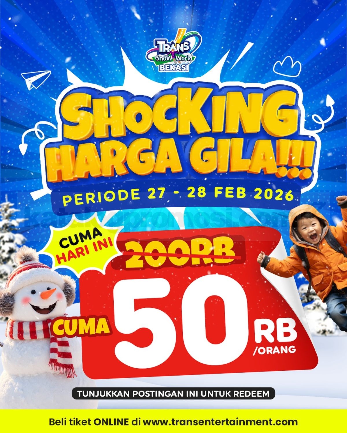 Makin yakin kan kalau harga segini jarang banget ada? Yuk atur jadwal kamu tanggal 27–28 Februari 2026 dan nikmati sensasi salju dengan harga hemat lewat Promo Trans Snow World Shocking Harga Gila Rp. 50.000 ini sebelum periodenya berakhir.