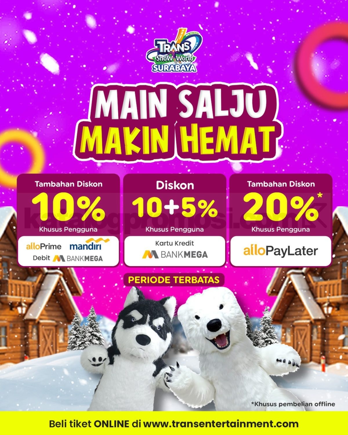 Keseruan bermain salju di Trans Snow World Surabaya kini bisa dinikmati dengan berbagai pilihan diskon menarik yang disesuaikan dengan metode pembayaran yang kamu gunakan. Mulai dari kartu debit, kartu kredit, hingga layanan paylater, semuanya memberikan keuntungan berbeda βοΈπ₯³