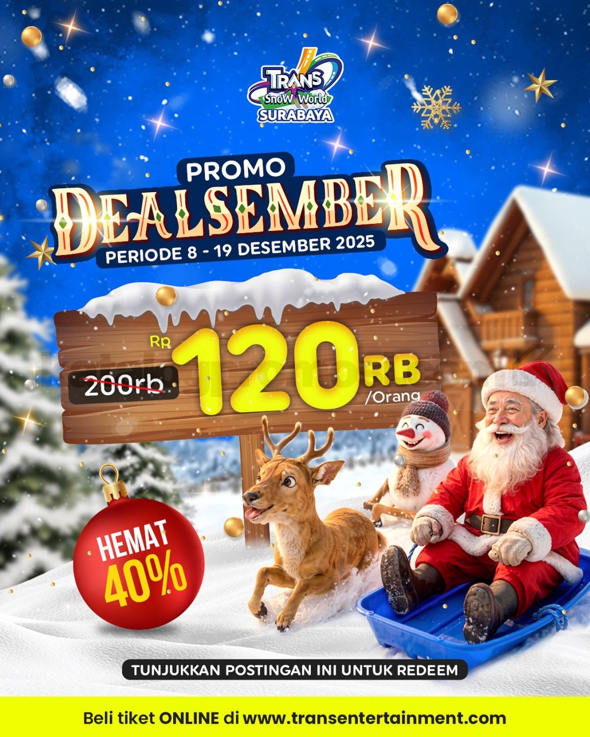 Promo Trans Snow World Surabaya Dealsember tiket Rp.120.000 per orang, berlaku 8 Desember 2025 – 19 Desember 2025 di Surabaya.