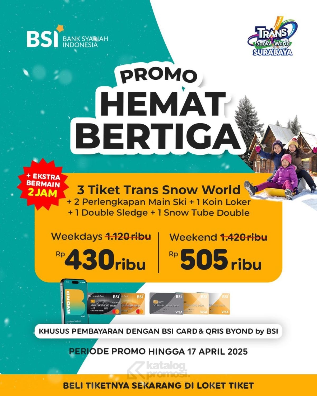 Liburan akhir tahun makin seru dengan Promo Trans Snow World Surabaya Presale-2 cuma Rp. 85.000! π Snowfriends yang kemarin belum kebagian tiket presale, sekarang ada kesempatan kedua. Dapatkan tiket dengan harga hemat Rp. 85.000/orang untuk menikmati semua wahana dan atraksi seru di Trans Snow World Surabaya bersama teman atau keluarga. β·οΈβοΈ