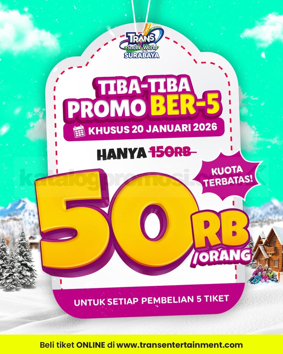 Promo Trans Snow World Surabaya main salju Rp. 250.000 dapat 5 tiket termasuk boots dan chairlift, mekanisme pembelian langsung berlaku 20 Januari 2026 di Trans Snow World Surabaya