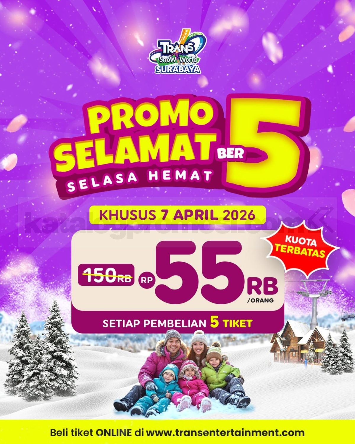 Promo Trans Snow World Surabaya Selasa Hemat Rp. 55.000 dengan pembelian 5 tiket, berlaku 7 April 2026 di Trans Snow World Surabaya.