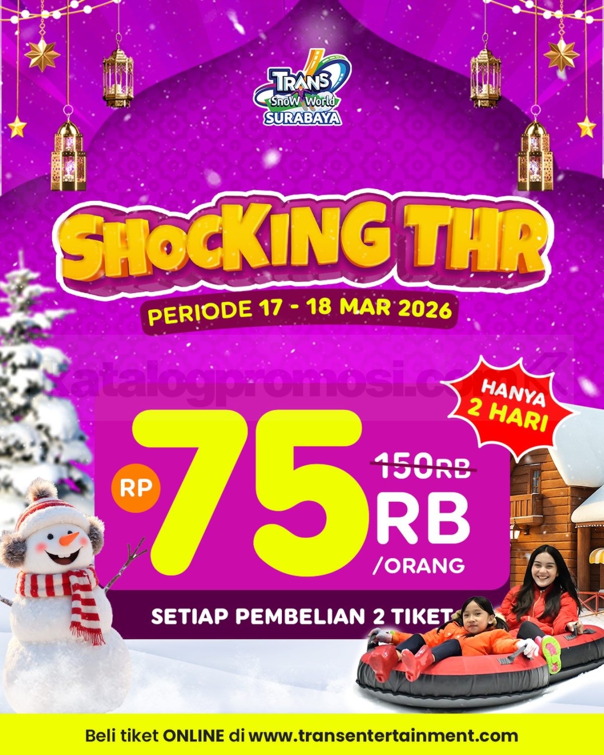Promo Trans Snow World Surabaya Shocking THR Rp. 75.000 per orang dengan pembelian 2 tiket berlaku mulai tanggal 17 Maret 2026 – 18 Maret 2026 di Trans Snow World Surabaya.