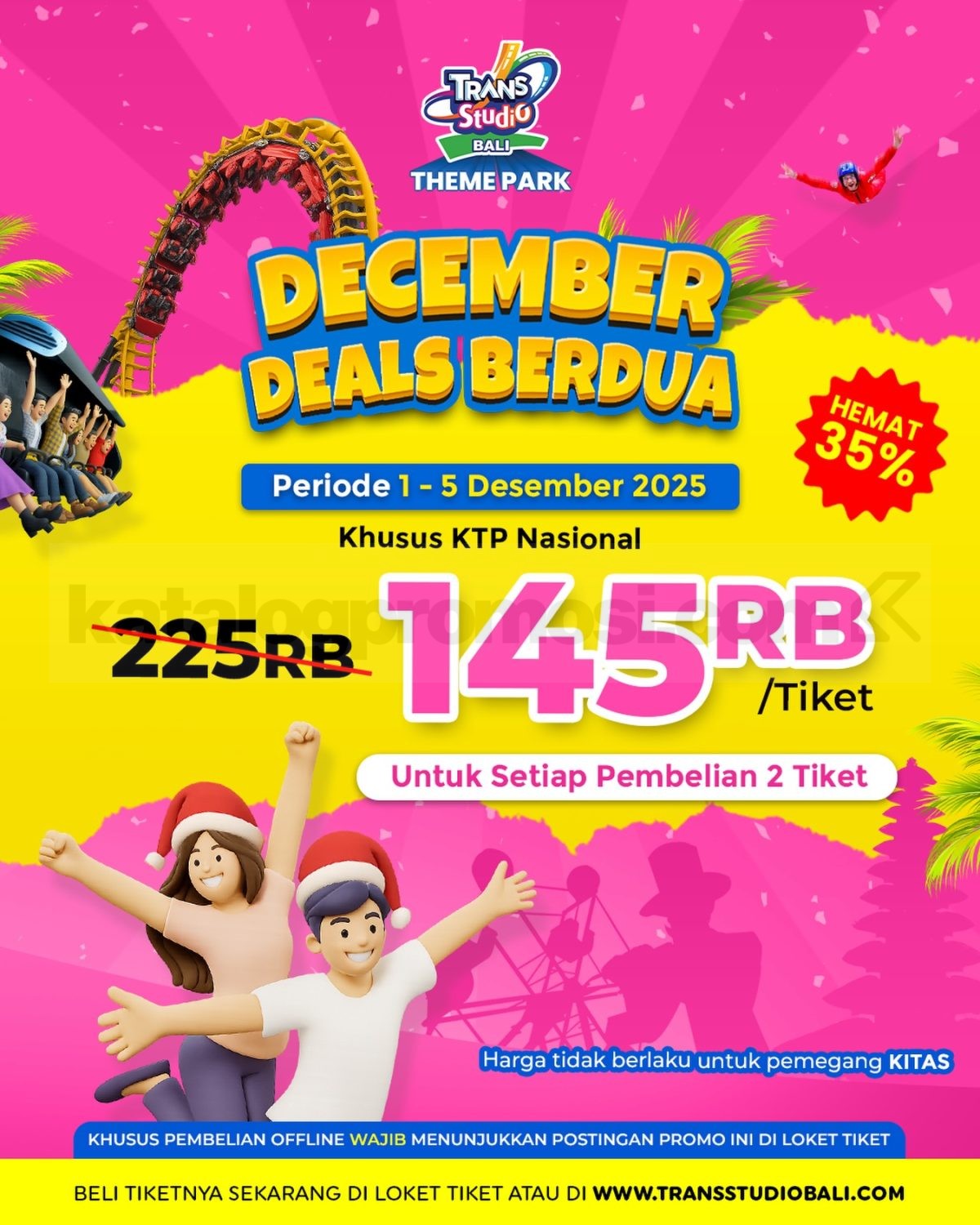 Promo Trans Studio Bali December Deal Berdua Rp.145 ribu untuk pemilik KTP Nasional dengan pembelian minimal dua tiket berlaku 1–5 Desember 2025.