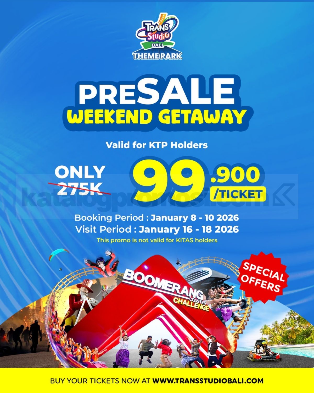Promo Trans Studio Bali Presale Weekend Getaway Tiket Rp. 99.900 untuk pemegang KTP dengan periode booking terbatas, berlaku mulai tanggal 8 Januari 2026 – 10 Januari 2026 di Trans Studio Bali.