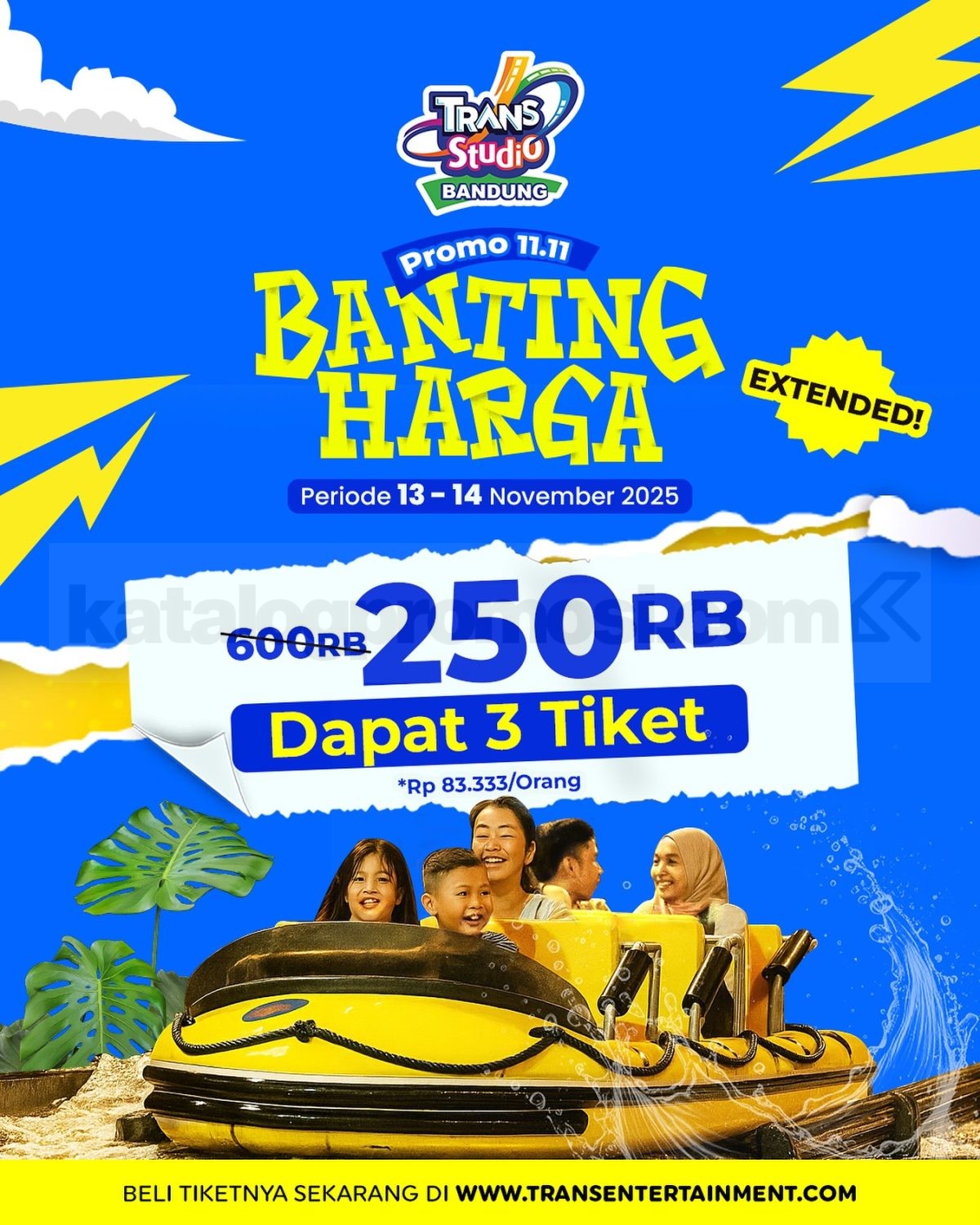 Promo Trans Studio Bandung 11.11 Banting Harga Tiket Rp.250.000 untuk 3 tiket sekaligus, berlaku 13–14 November 2025 di Bandung.
