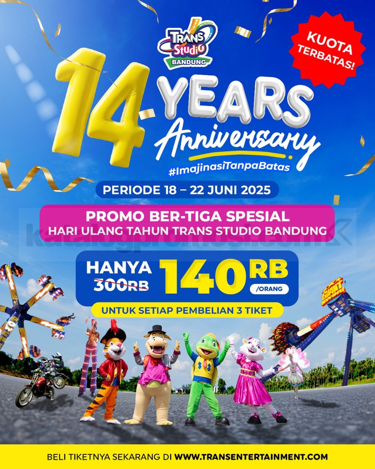Promo berlaku untuk pembelian tiket masuk Trans Studio Bandung melalui situs resmi www.transentertainment.com.