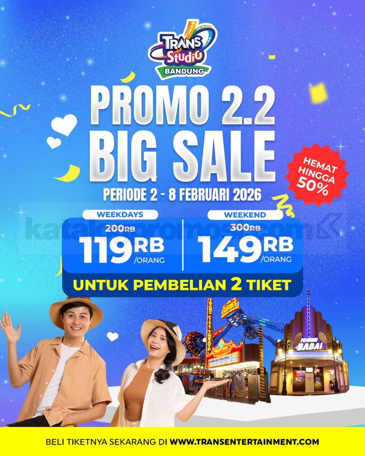 Promo Trans Studio Bandung 2.2 Big Sale diskon hingga 50% dengan harga mulai Rp. 119.000 per orang, minimal beli 2 tiket, berlaku mulai tanggal 2 Februari 2026 – 8 Februari 2026 di Trans Studio Bandung.