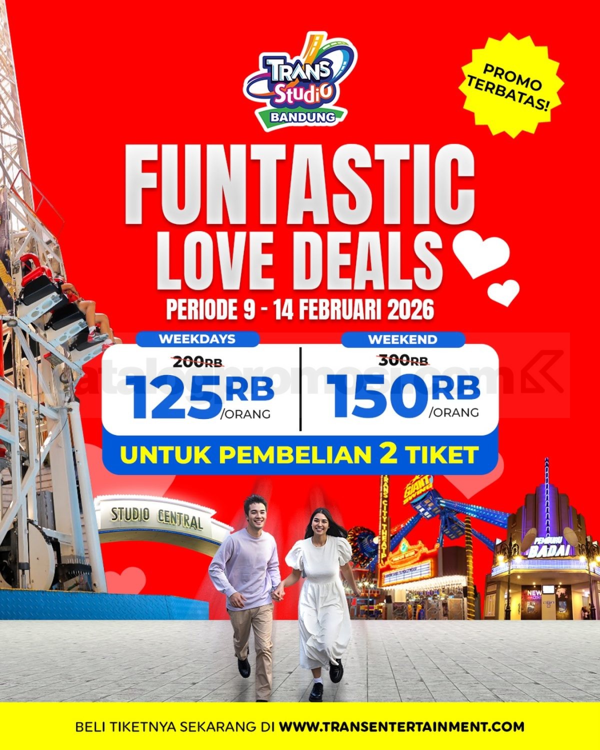 Promo Trans Studio Bandung Funtastic Love Deals Tiket mulai Rp. 125.000 beli 2 tiket untuk Valentine seru, berlaku mulai tanggal 9-14 Februari 2026 di Trans Studio Bandung.