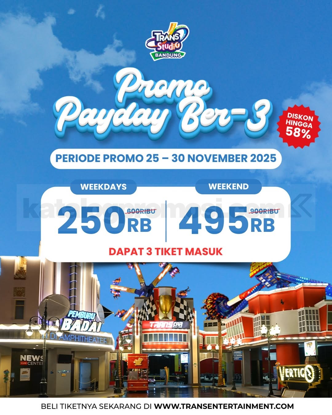 Promo Trans Studio Bandung Payday Ber-3 mulai Rp. 250.000, weekdays hemat Rp. 250RB & weekend Rp. 495RB, berlaku 25β30 November 2025