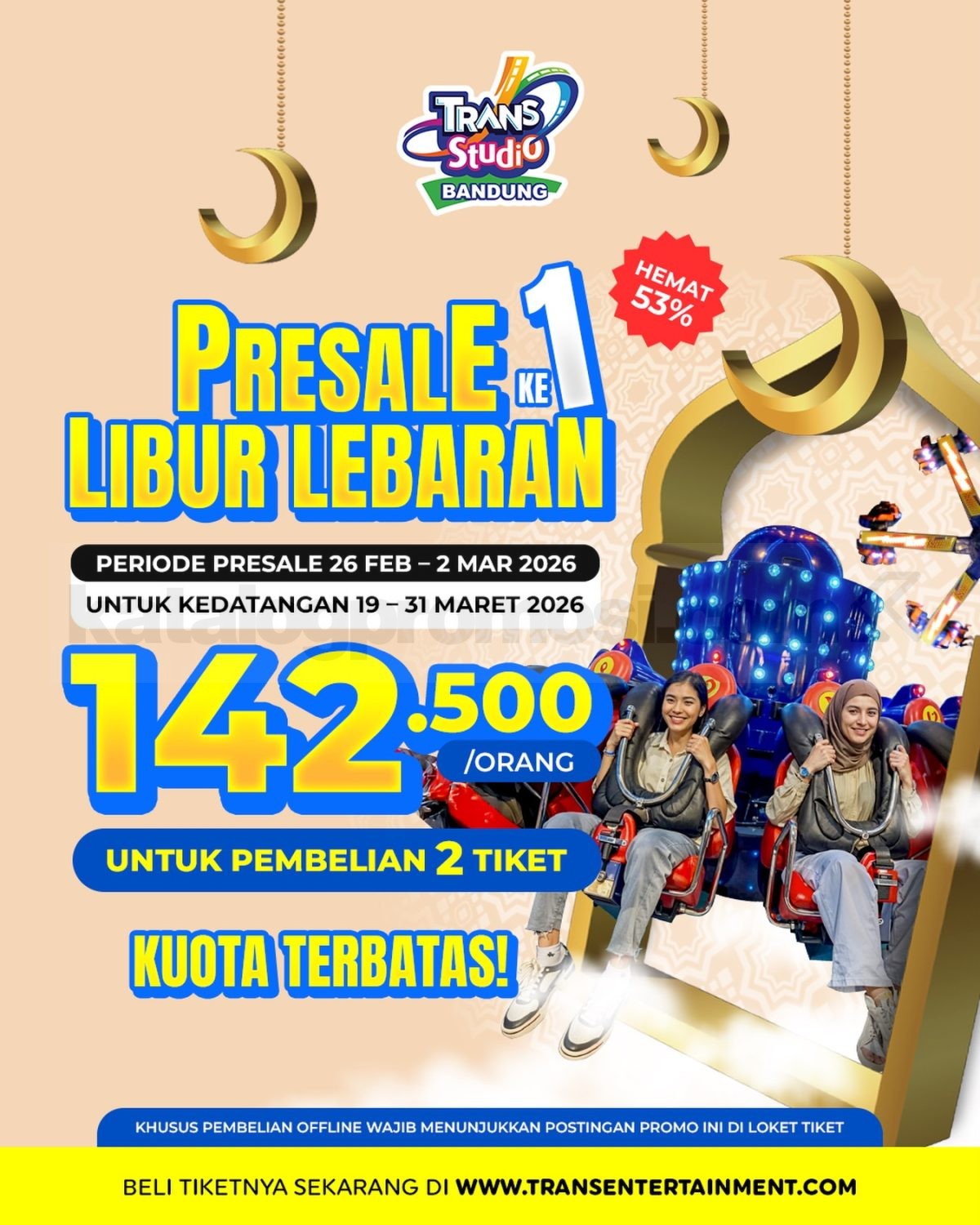 Promo Trans Studio Bandung Presale 1 Libur Lebaran Rp. 142.500 hemat 53% minimal beli 2 tiket berlaku 26 Februari 2026 – 2 Maret 2026.