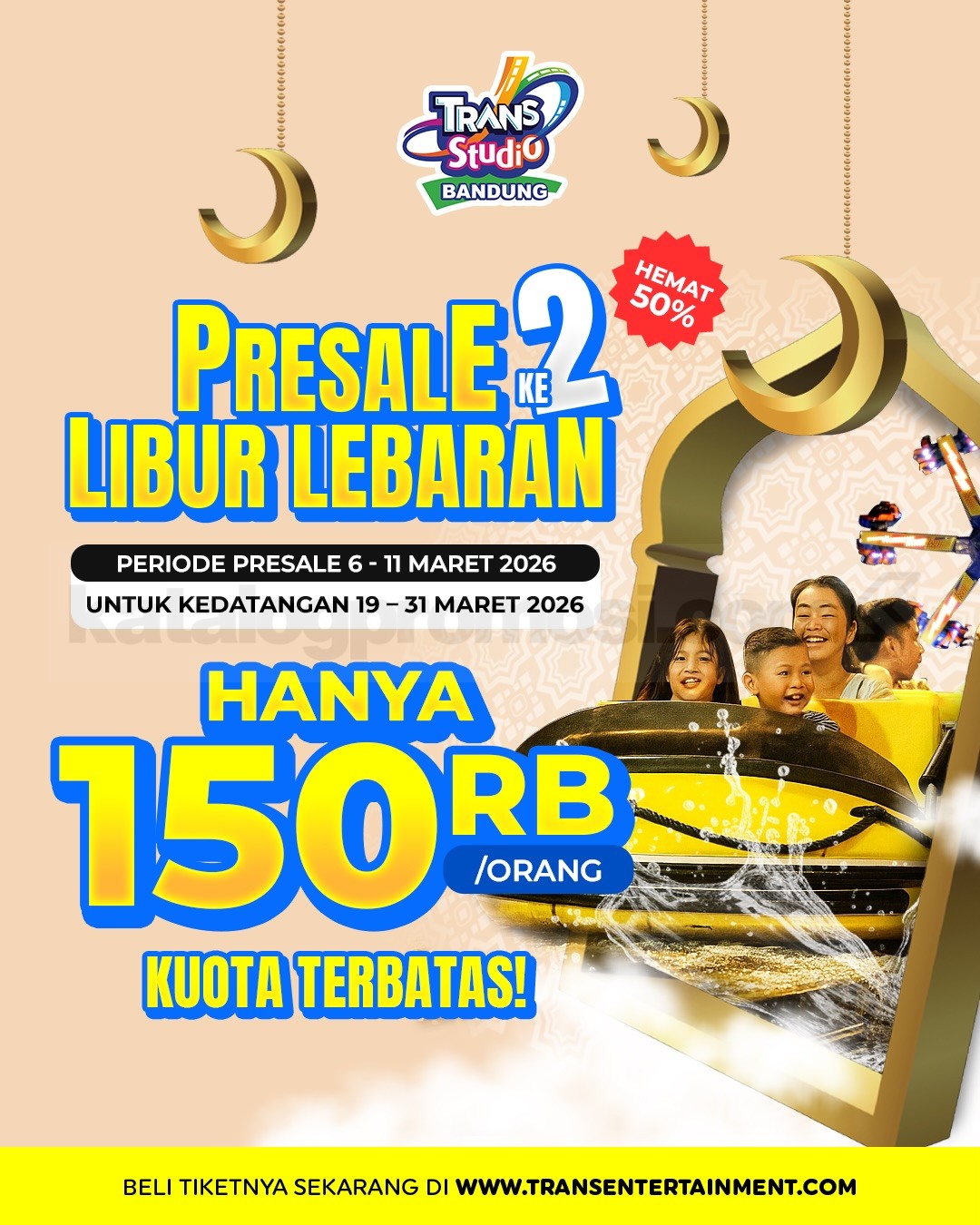 Promo Trans Studio Bandung Presale 2 Libur Lebaran Rp. 150.000 tiket bermain di indoor theme park. Berlaku mulai tanggal 6 Maret 2026 – 11 Maret 2026.