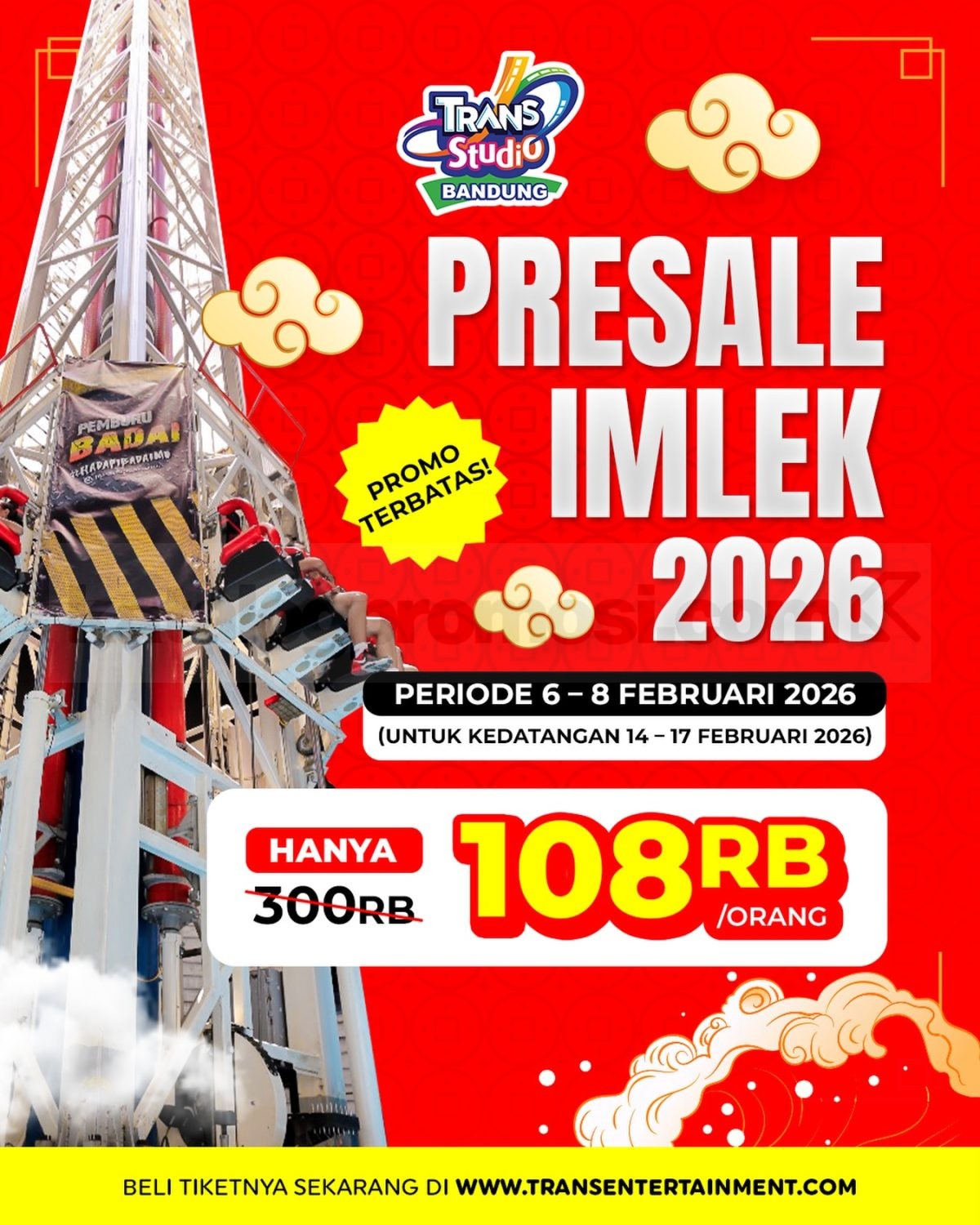 Promo Trans Studio Bandung Presale Imlek Tiket Rp. 108.000 untuk liburan Imlek dengan harga spesial, pembelian online berlaku mulai tanggal 6-8 Februari 2026 di Trans Studio Bandung.