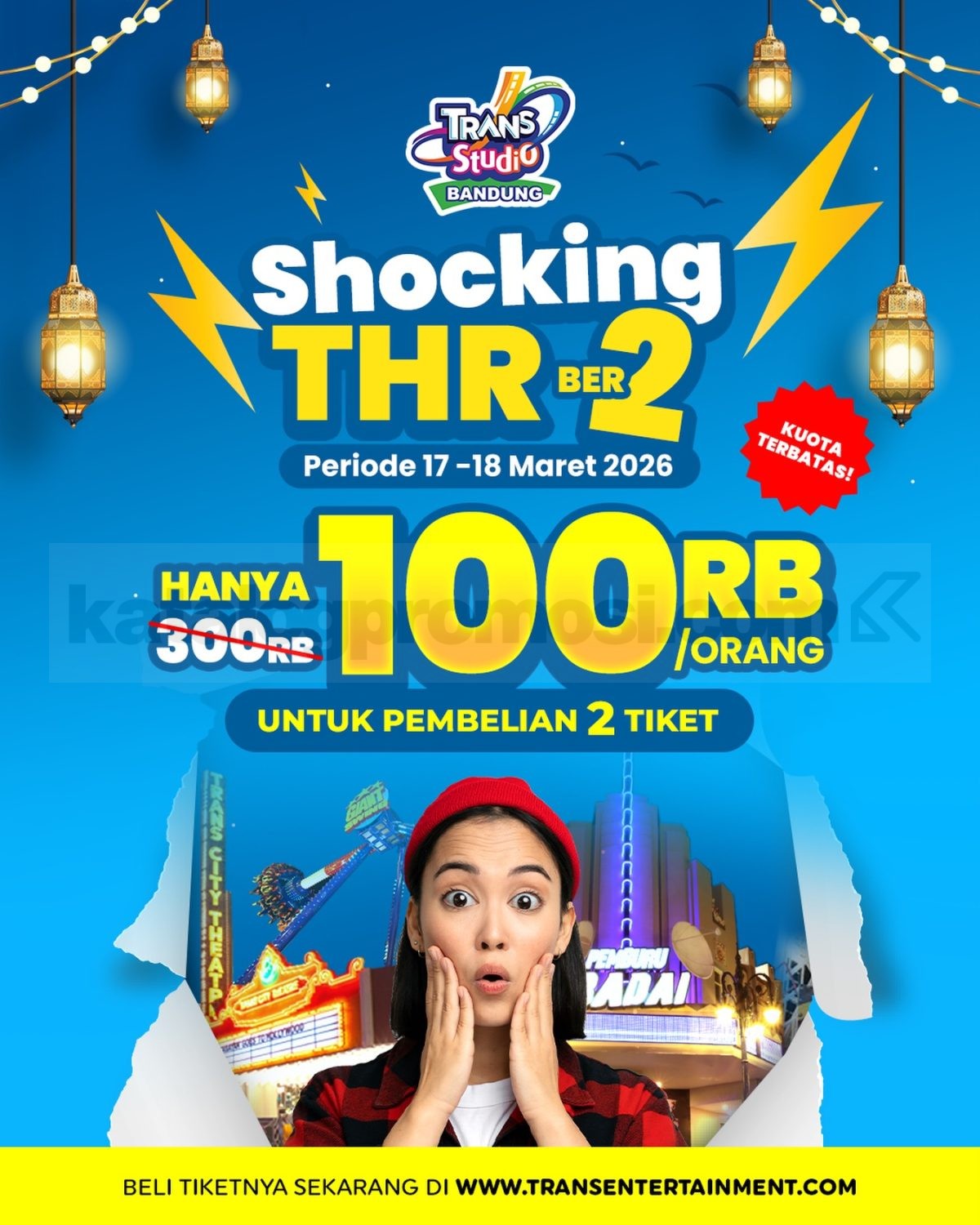 Promo Trans Studio Bandung Shocking THR Tiket Rp. 100.000 untuk pembelian minimal 2 tiket berlaku mulai tanggal 17 Maret 2026 – 18 Maret 2026 di Trans Studio Bandung.